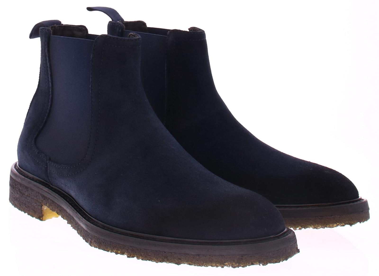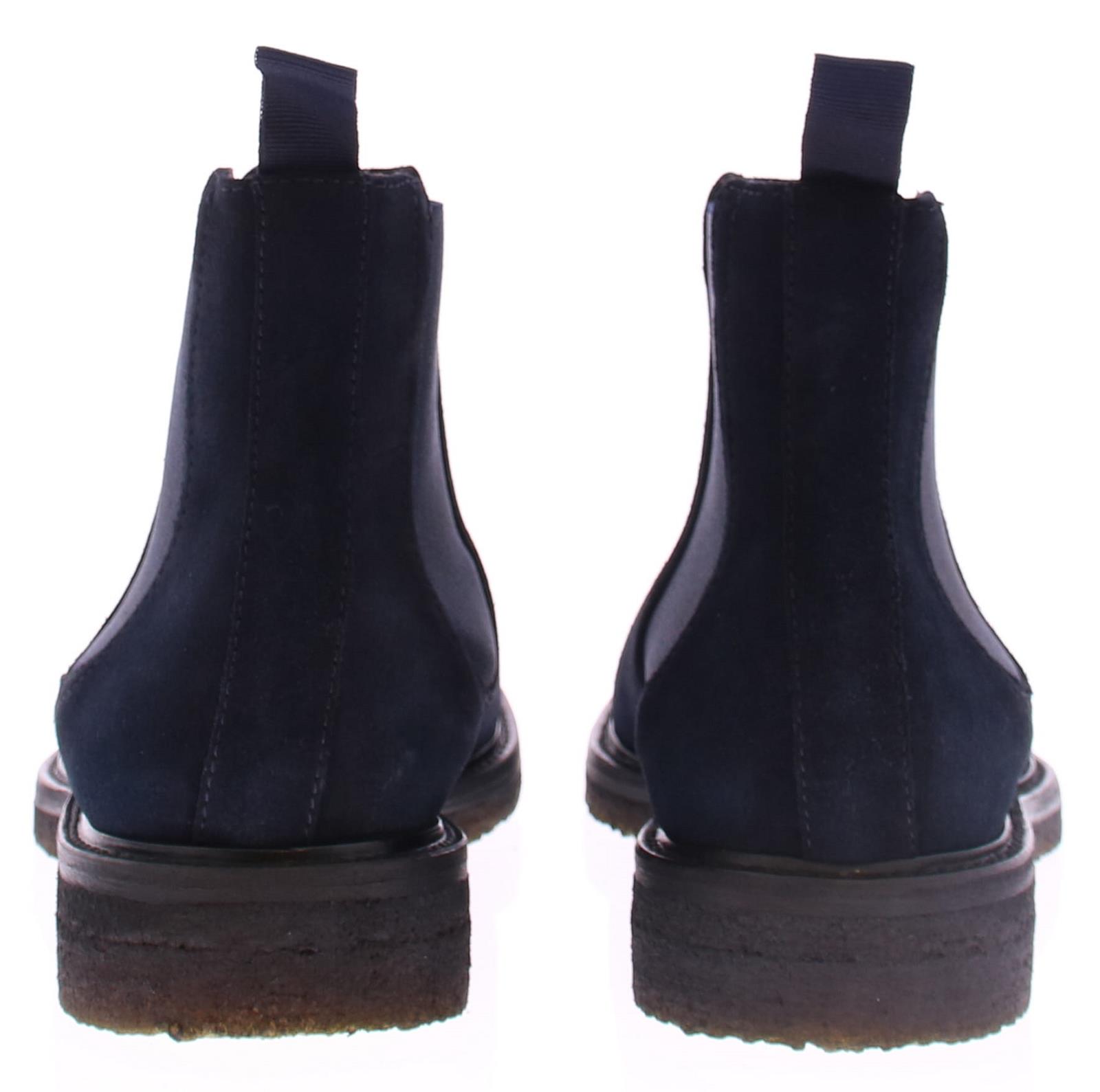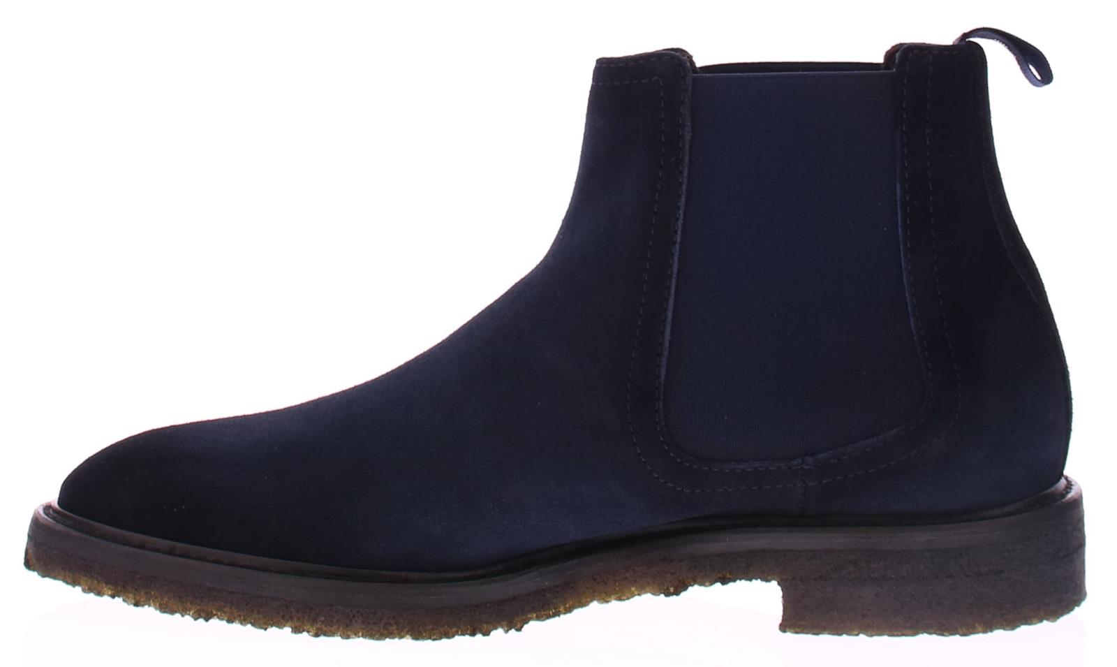 Heren chelseaboot van Daniel Kenneth. De schoen heeft een donkerblauw suede bovenwerk en is gemaakt met een leren voering op een crepe zool.