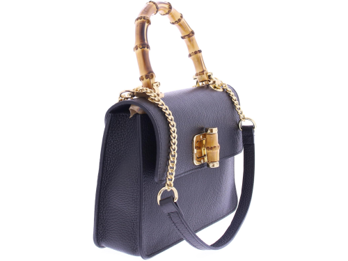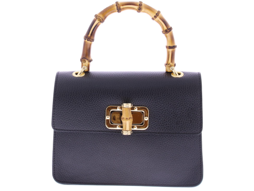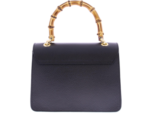 Zwart leren dames tas van Di Lauro. Dit tasje heeft een bamboe handvat en een leuke sluiting met bamboe details. Het tasje komt met een los bijgeleverd schouderhengsel. De breedte is 21 cm, de hoogte is 17 cm en de diepte van de bodem is 6.5 cm.