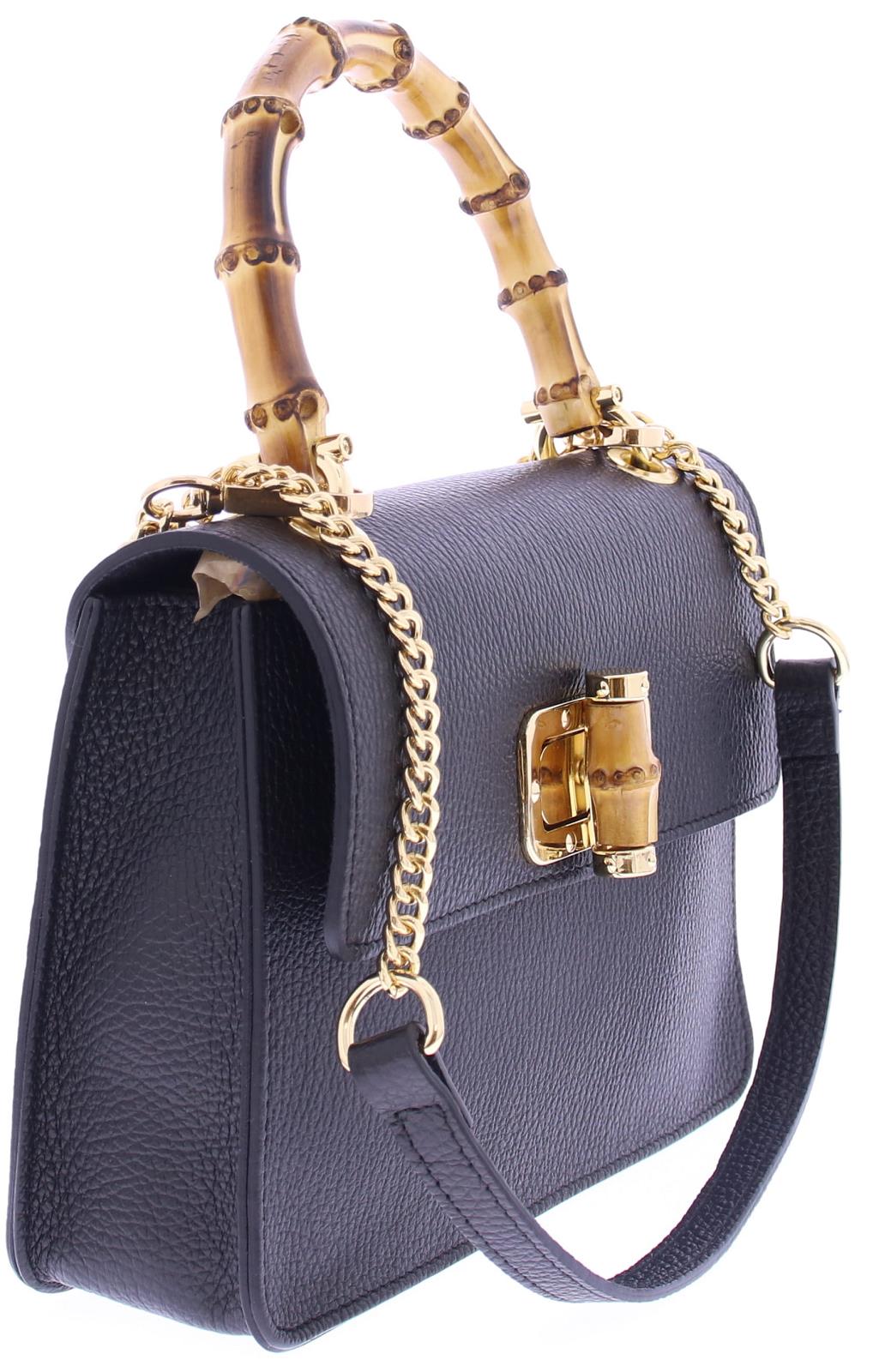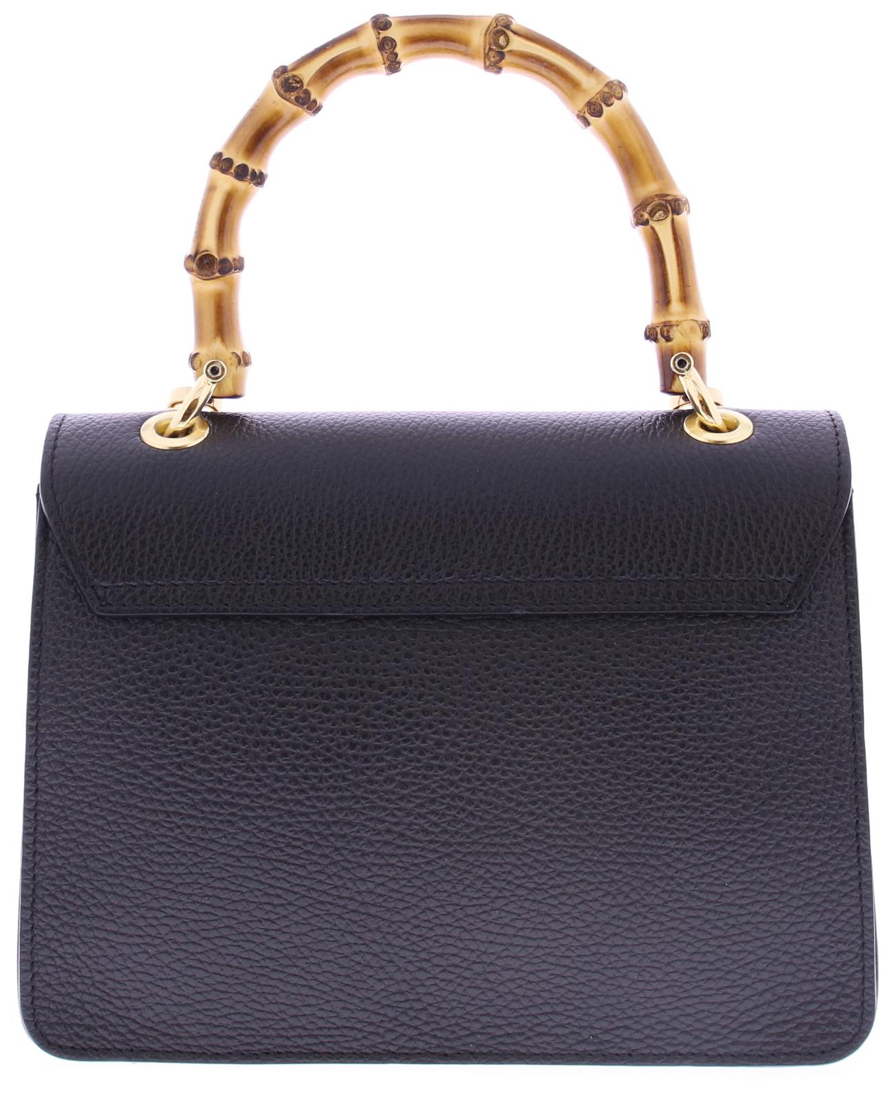 Zwart leren dames tas van Di Lauro. Dit tasje heeft een bamboe handvat en een leuke sluiting met bamboe details. Het tasje komt met een los bijgeleverd schouderhengsel. De breedte is 21 cm, de hoogte is 17 cm en de diepte van de bodem is 6.5 cm.