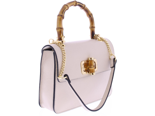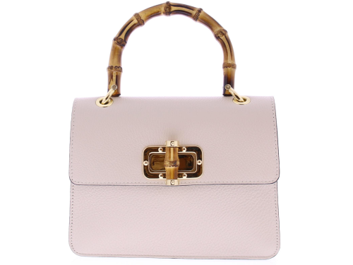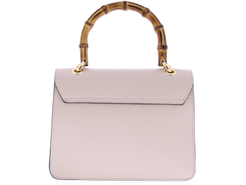 Room leren dames tas van Di Lauro. Dit tasje heeft een bamboe handvat en een leuke sluiting met bamboe details. Het tasje komt met een los bijgeleverd schouderhengsel. De breedte is 21 cm, de hoogte is 17 cm en de diepte van de bodem is 6.5 cm.