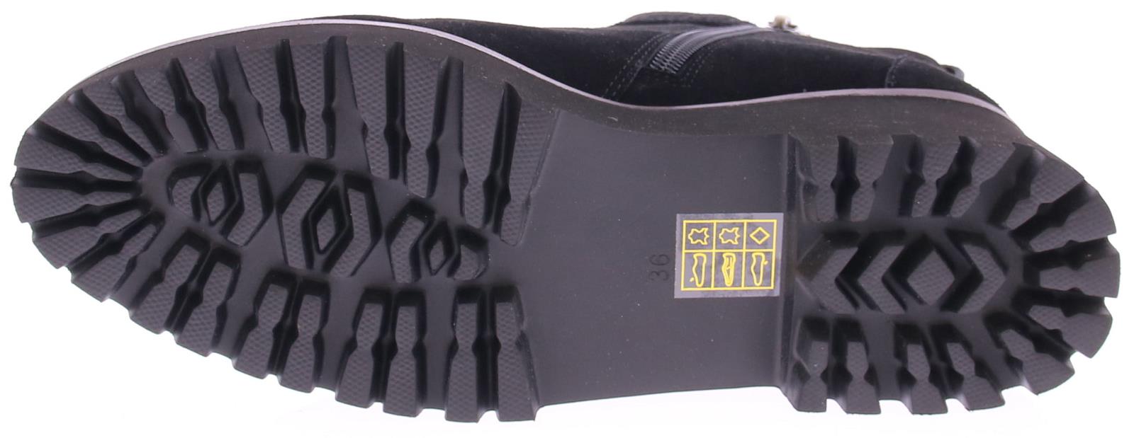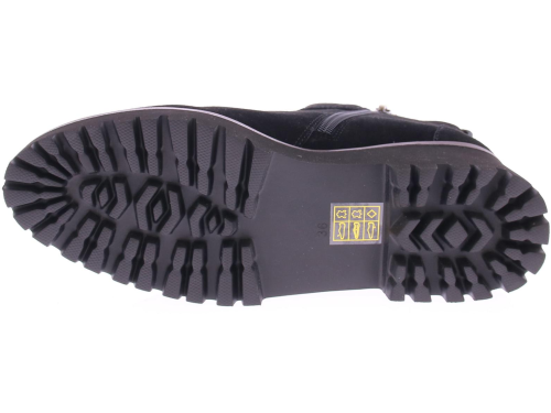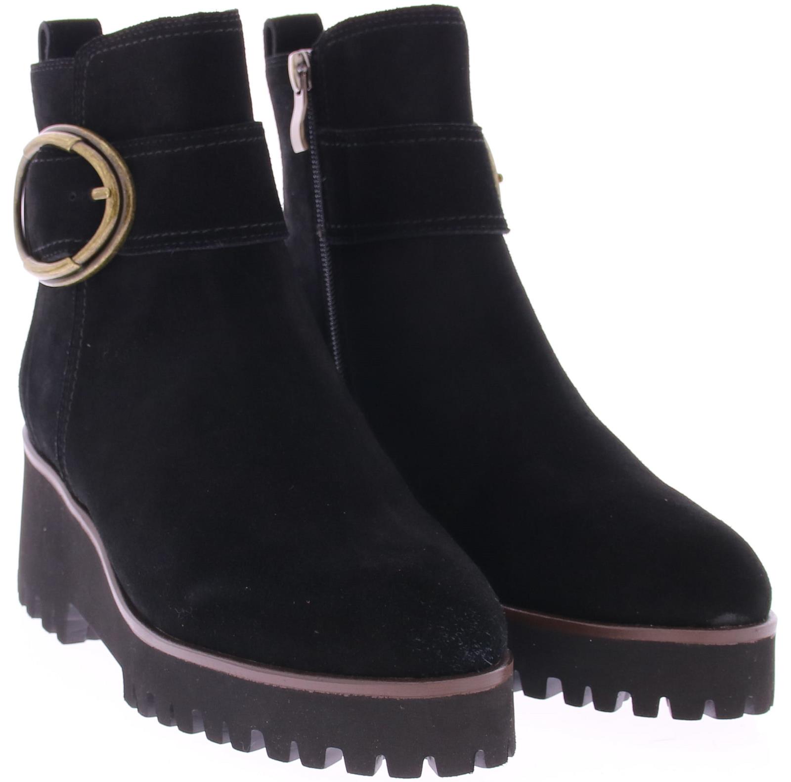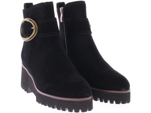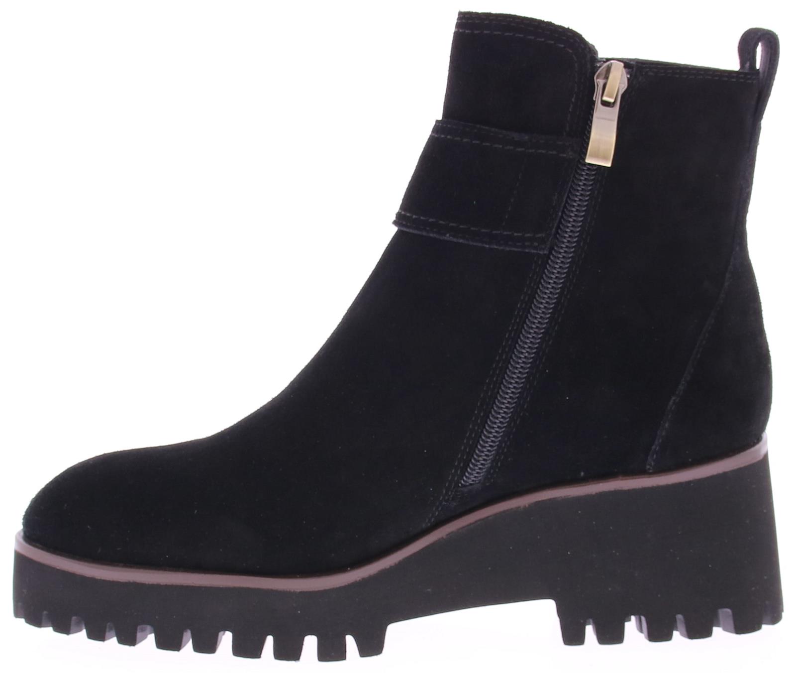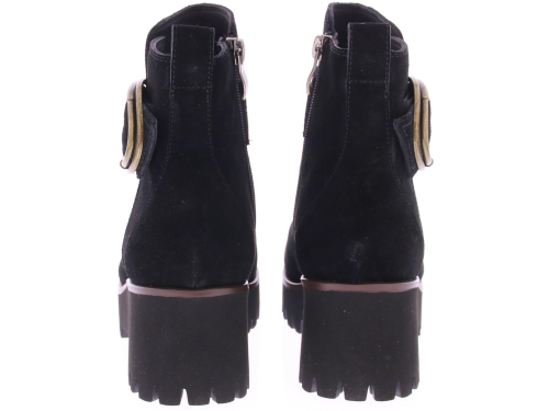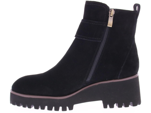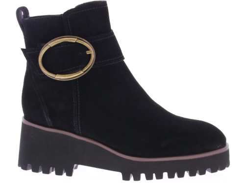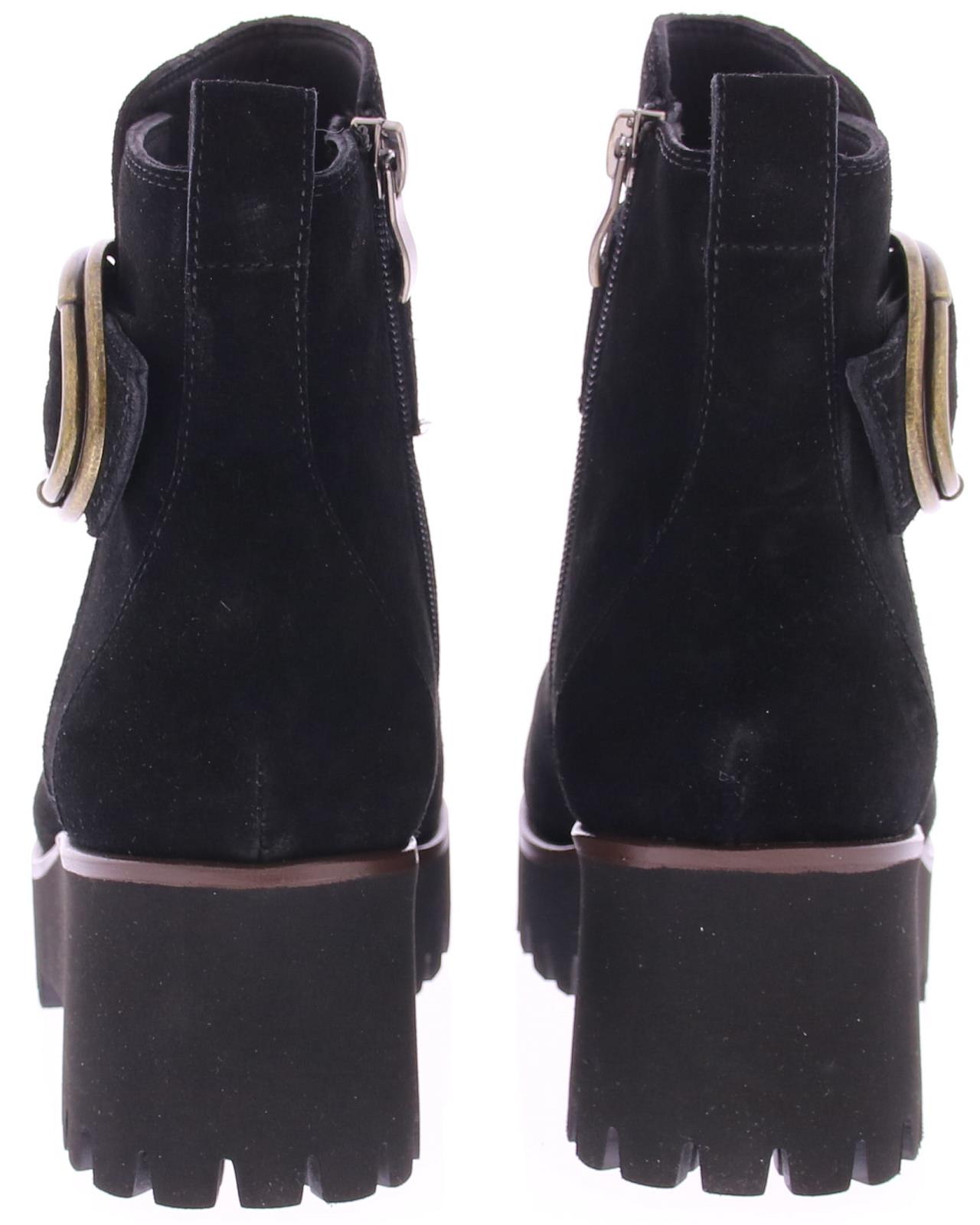 Zwart suede dames enkellaars van Di Lauro. Dit model heeft een een sleehak van 5 cm hoog en een grote goudkleurige gesp. De zool heeft een wat groffer profiel
