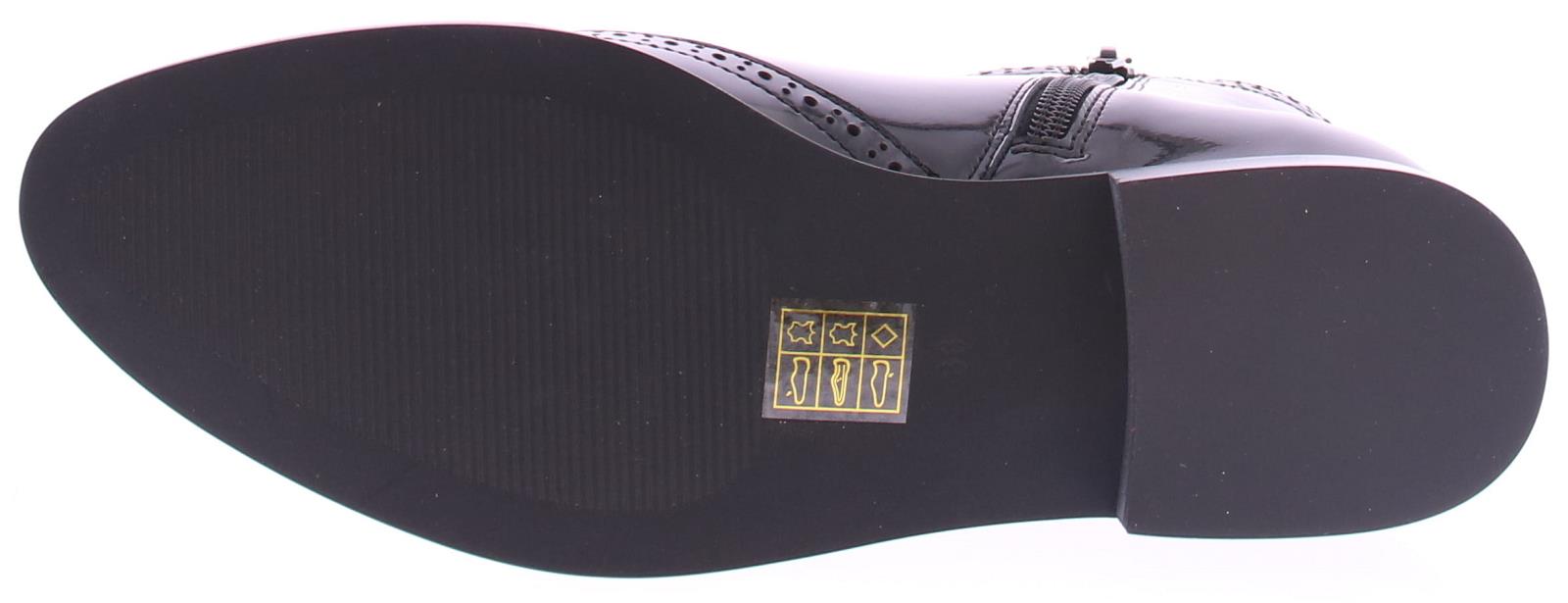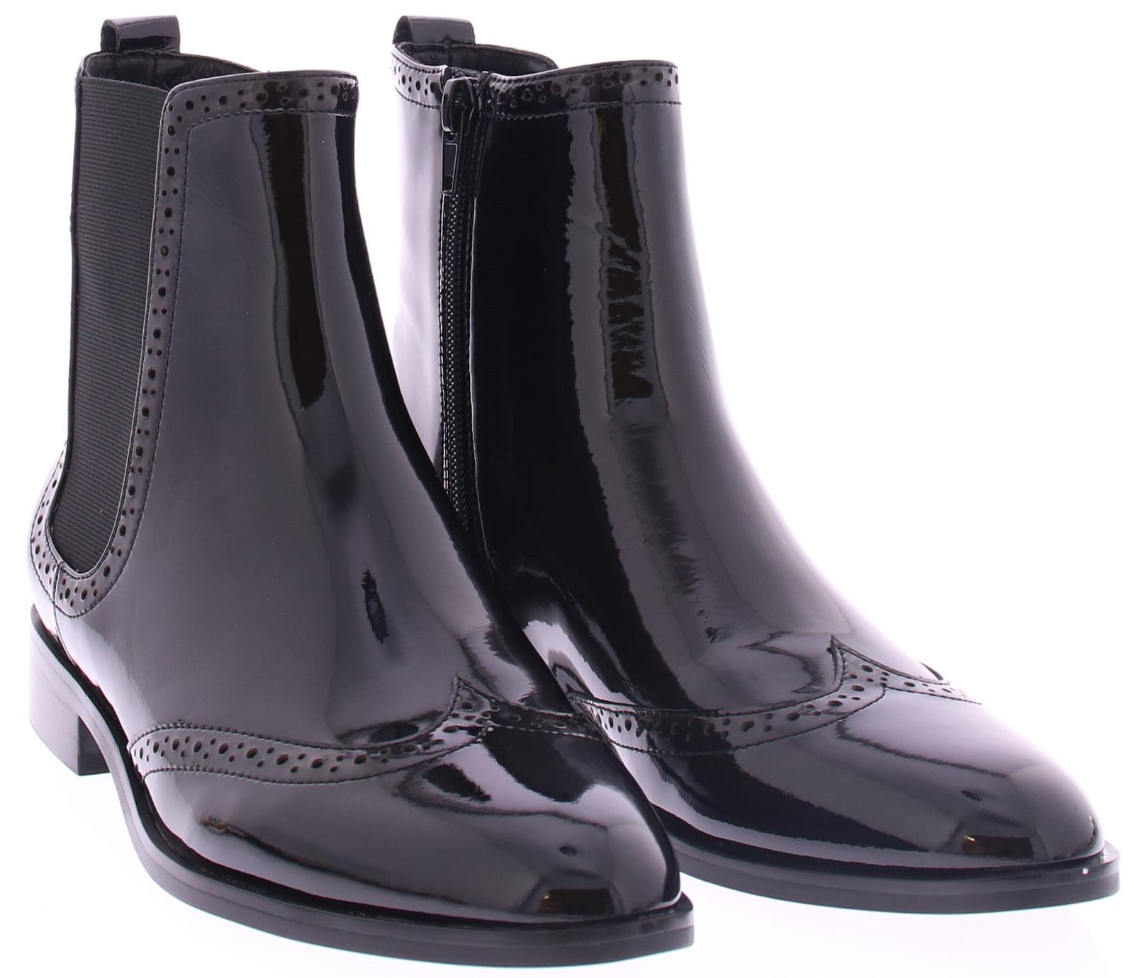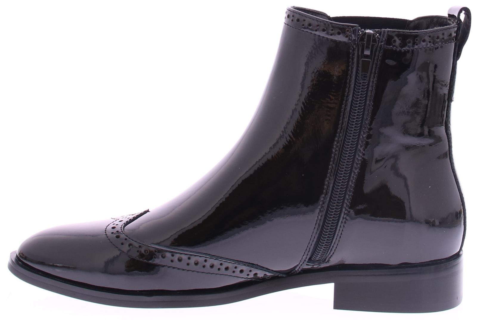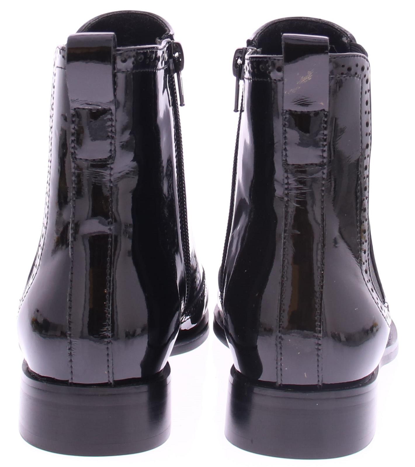 Zwart lak leren Chelsea enkellaars van Di Lauro. Deze laars heeft aan de buitenkant een elastieke inzet en aan de binnenkant een rits. De laarsjes zijn afgewerkt met geperforeerde belijningen en een hakje van 2 cm hoog. De voering is van leer en de zool van rubber.