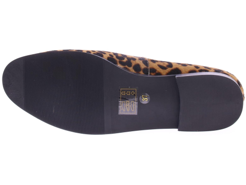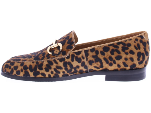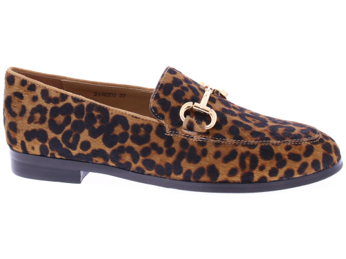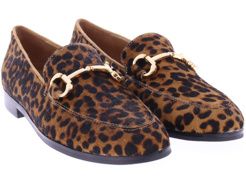 Dames instapper van Di Lauro. Deze instapper van pony met leopard print heeft een ovale leest en een gouden bit op de wreef. Dit model is leergevoerd, met een vast voetbed, en heeft een kunststof zool en een lage hak van 2 centimeter. Met deze mooie loafer geef je ieder outfit een chique uitstraling.