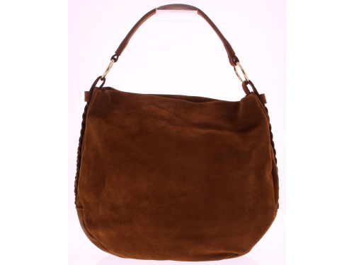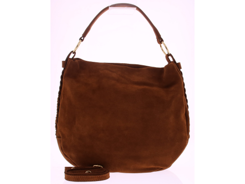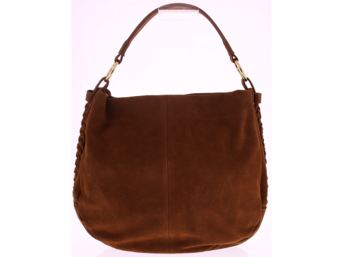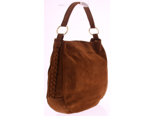 Middenbruin suede dames tas van Di Lauro. Deze nonchalante tas is afgewerkt met 2 gevlochten sierbandjes aan de zijkant. Het schouderhengsel heeft aan het uiteinde 2 goudkleurige ringen. De tas sluit met een rits en heeft als afmetingen 37x32x9.