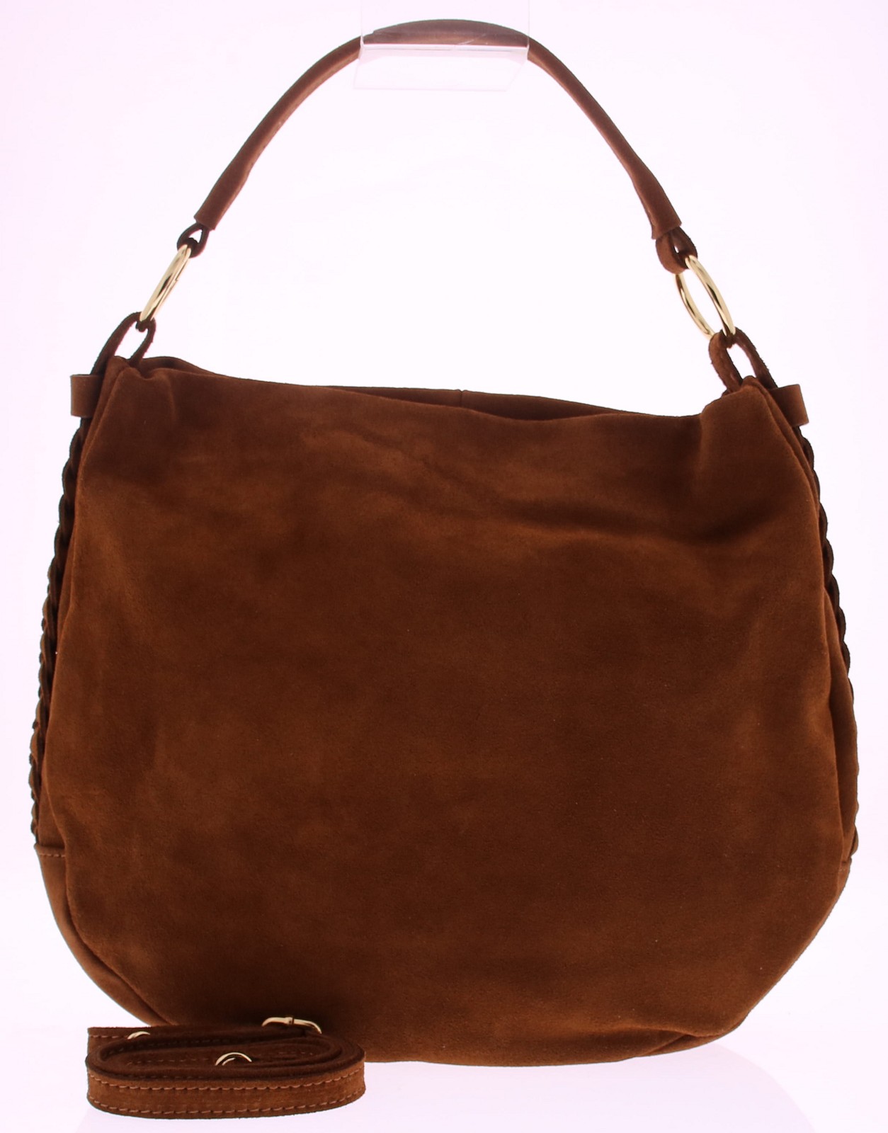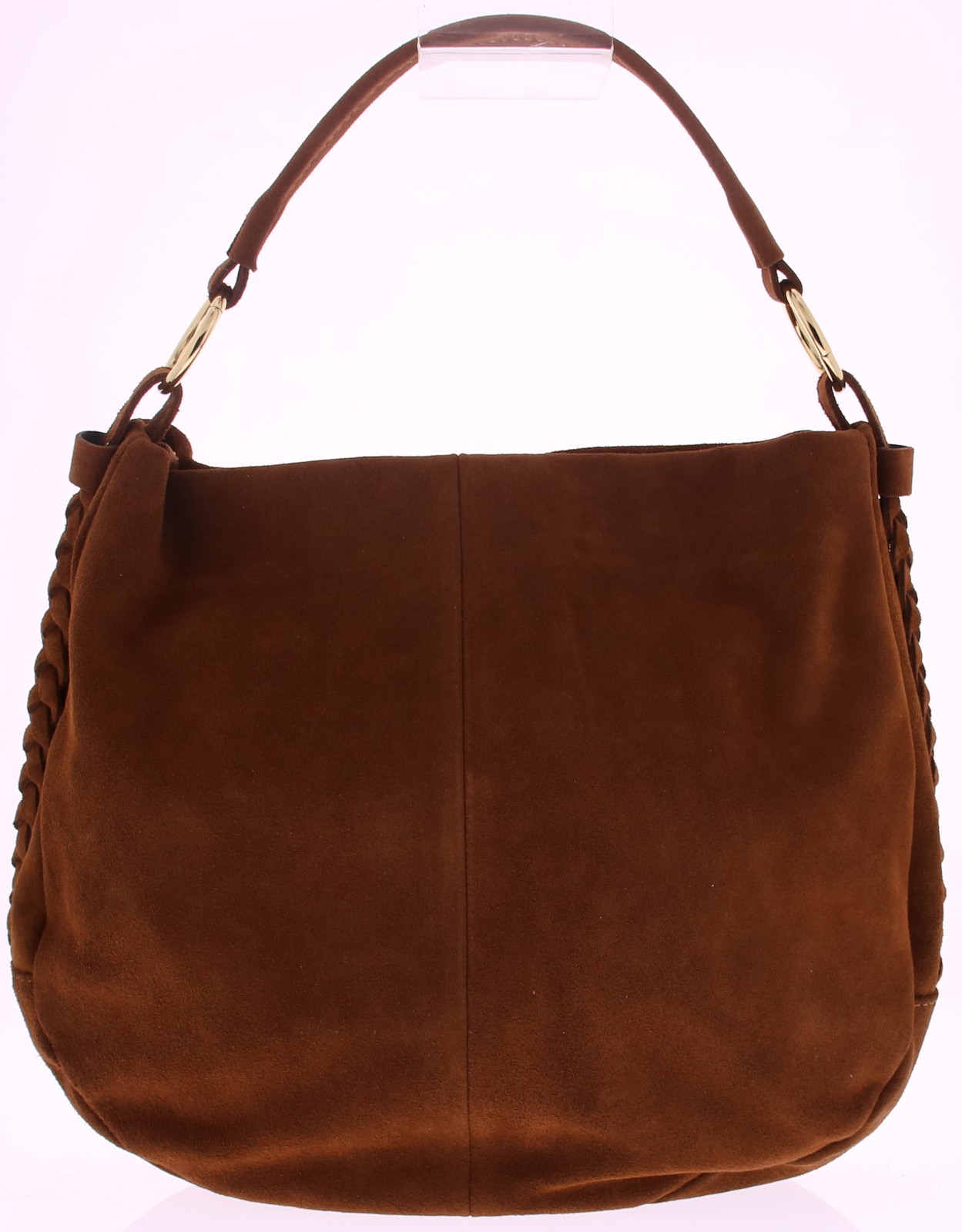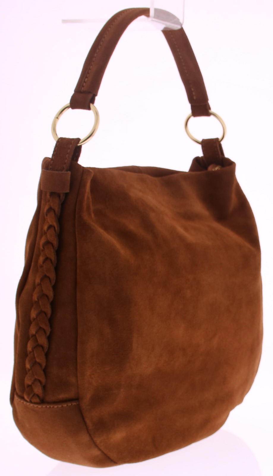Middenbruin suede dames tas van Di Lauro. Deze nonchalante tas is afgewerkt met 2 gevlochten sierbandjes aan de zijkant. Het schouderhengsel heeft aan het uiteinde 2 goudkleurige ringen. De tas sluit met een rits en heeft als afmetingen 37x32x9.
