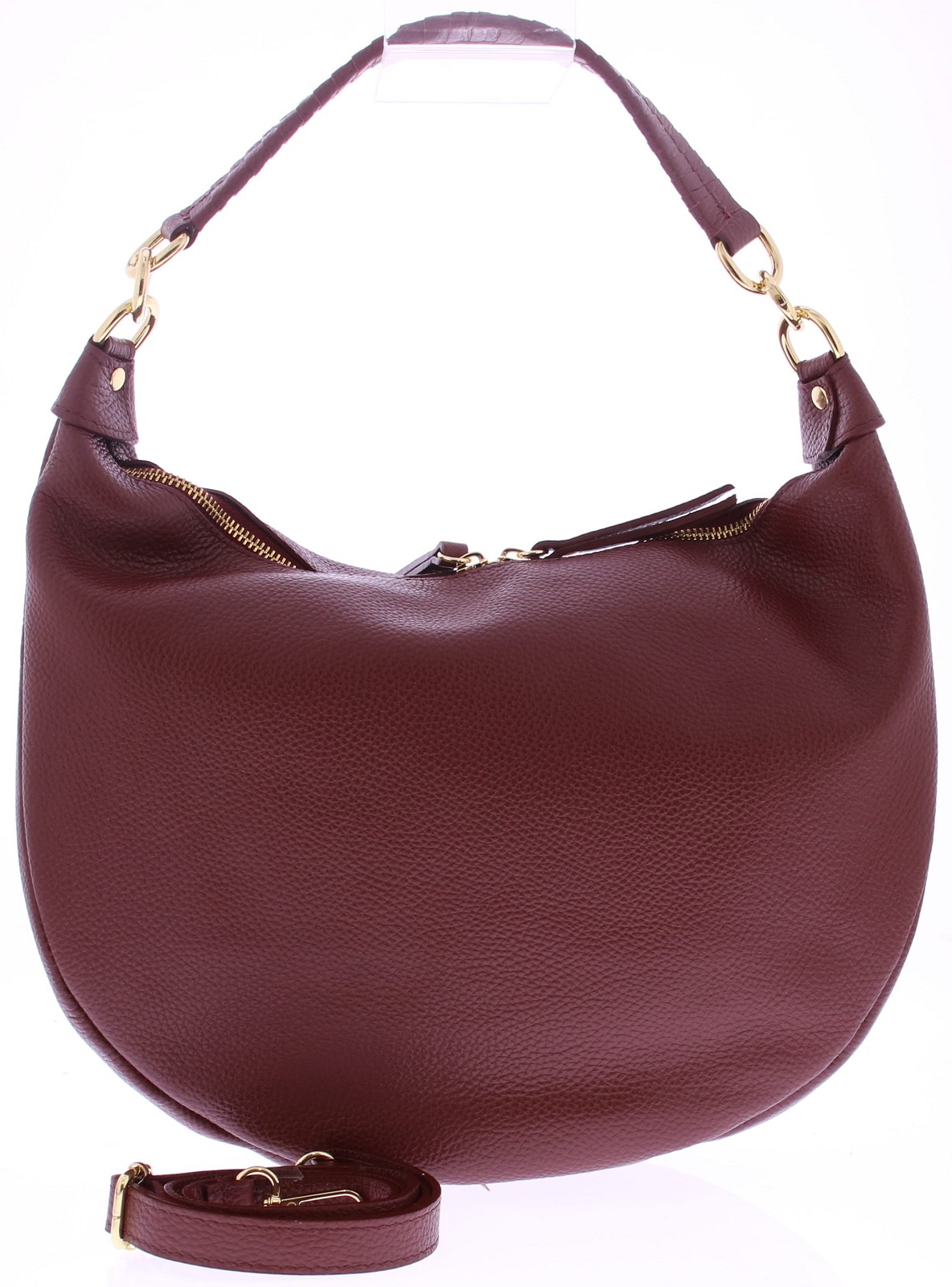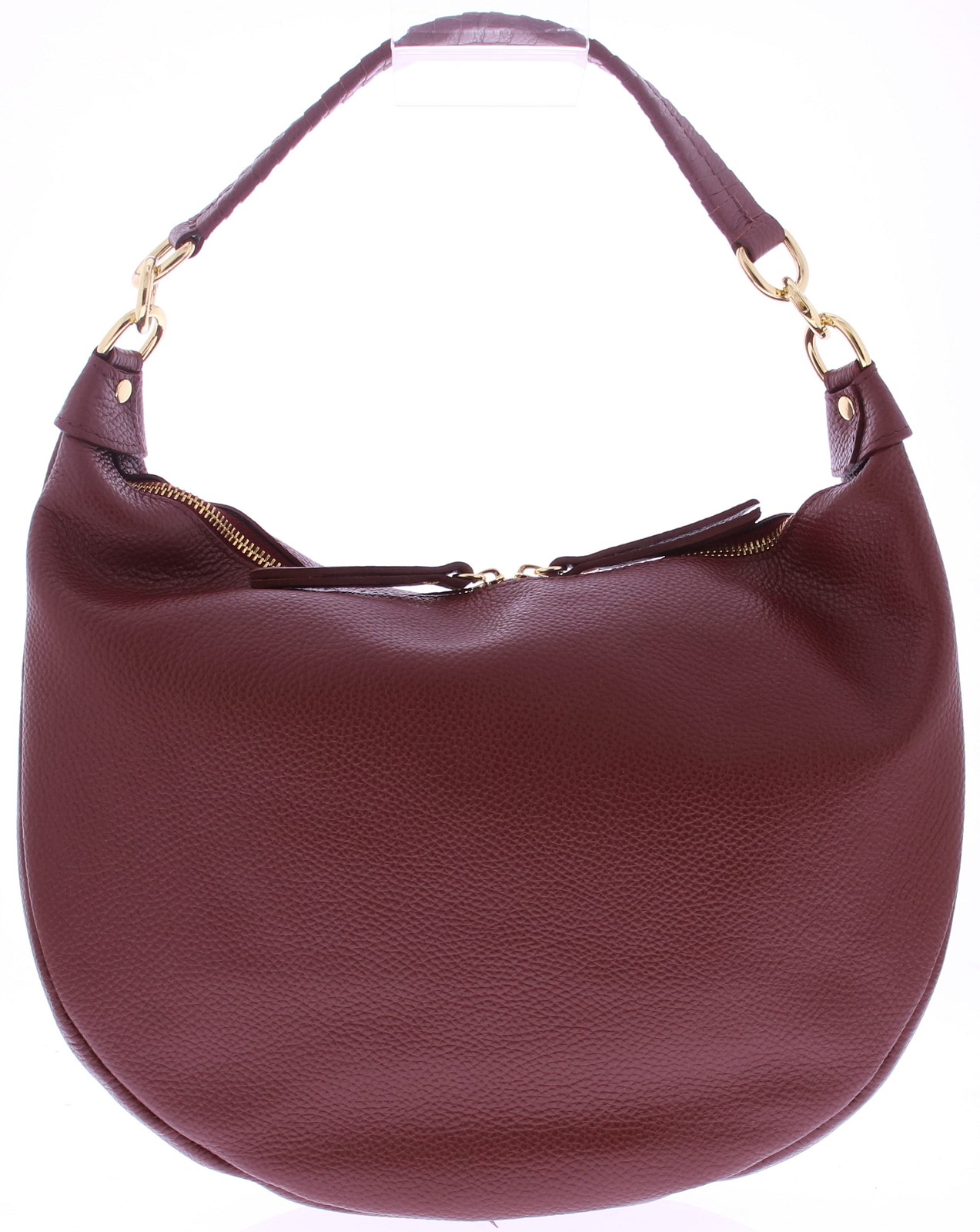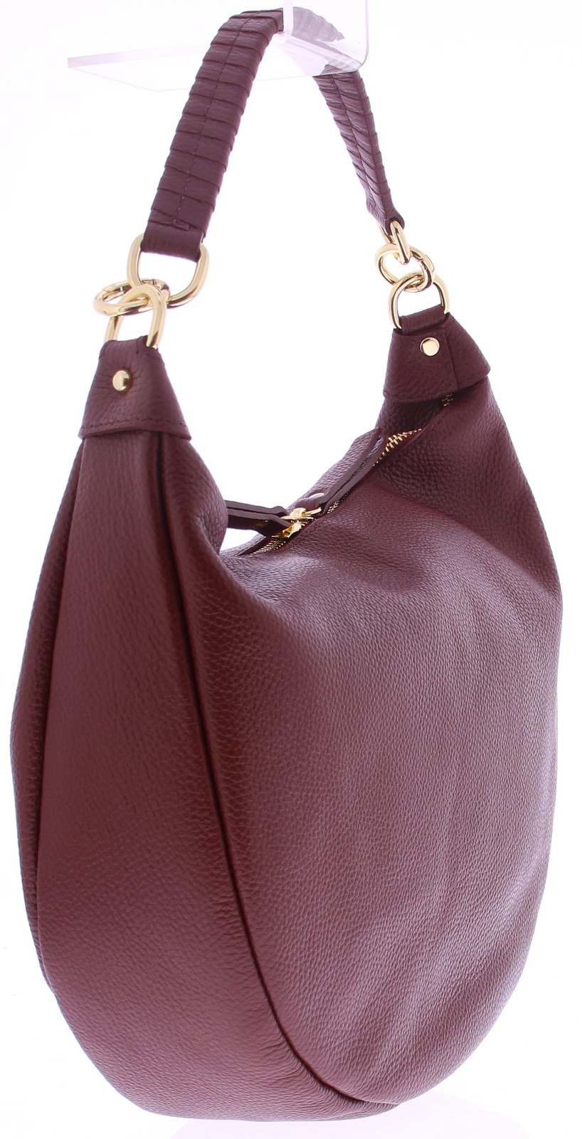 Bordeaux leren dames tas van Di Lauro. De afmetingen zijn 32x24x8. Het leer heeft een hele fijne structuur. Grain leer genoemd. Het schouderhengsel is van gevlochten leer gemaakt en heeft aan beide kanten gouden garneringen. De tas sluit met een rits. De lopers van de goudkleurige rits zijn voorzien van hetzelfde bordo leer. De voering is van stof en heeft naast het grote vak ook zijvakjes.