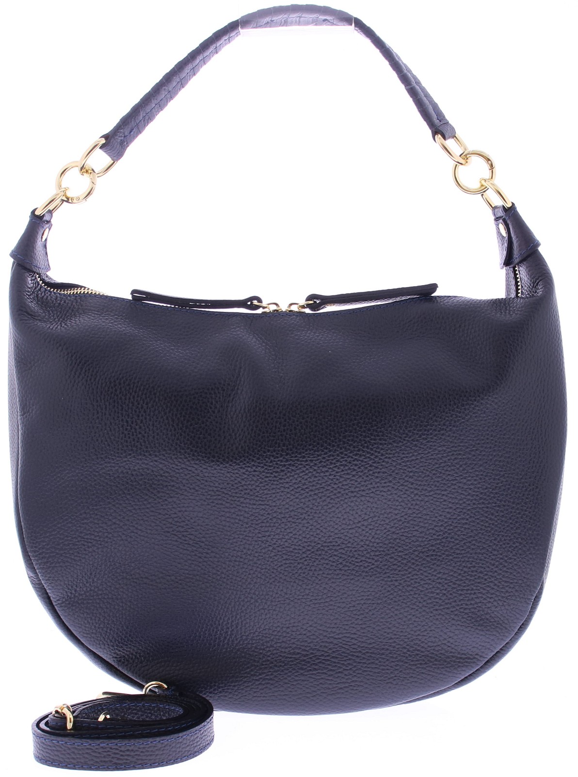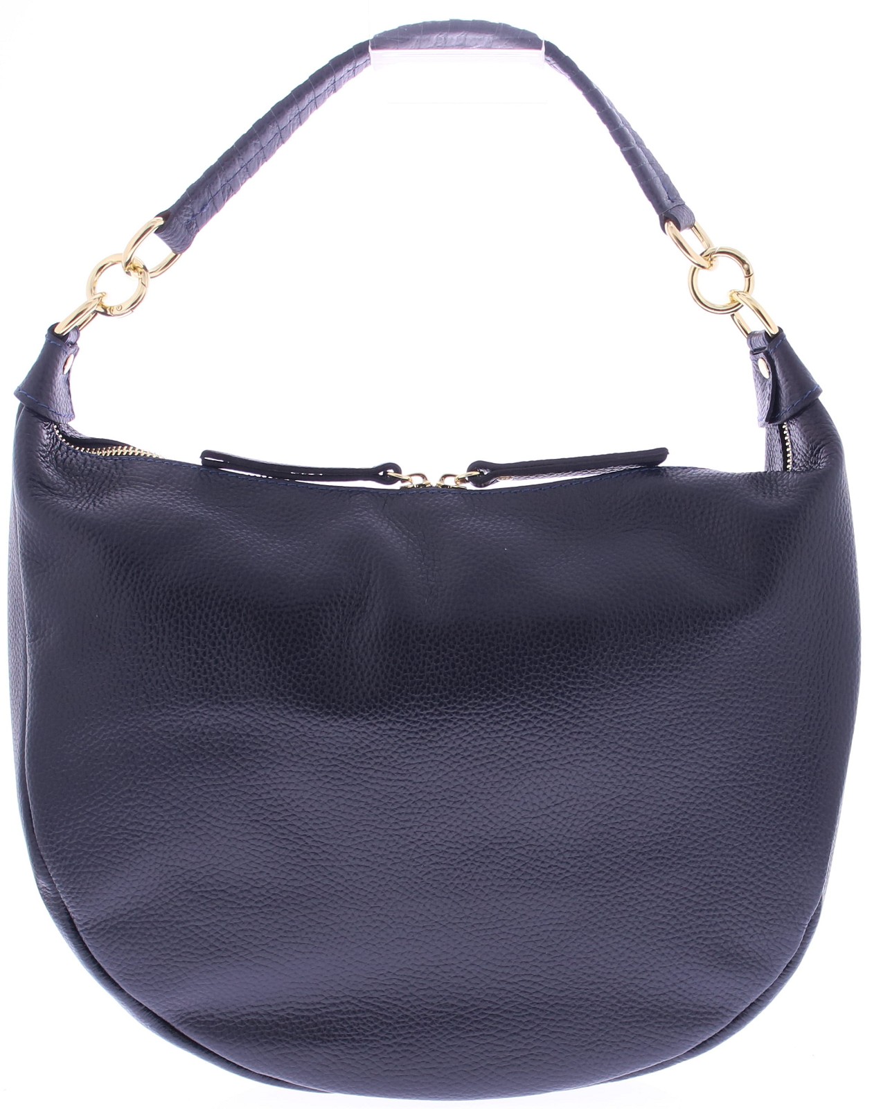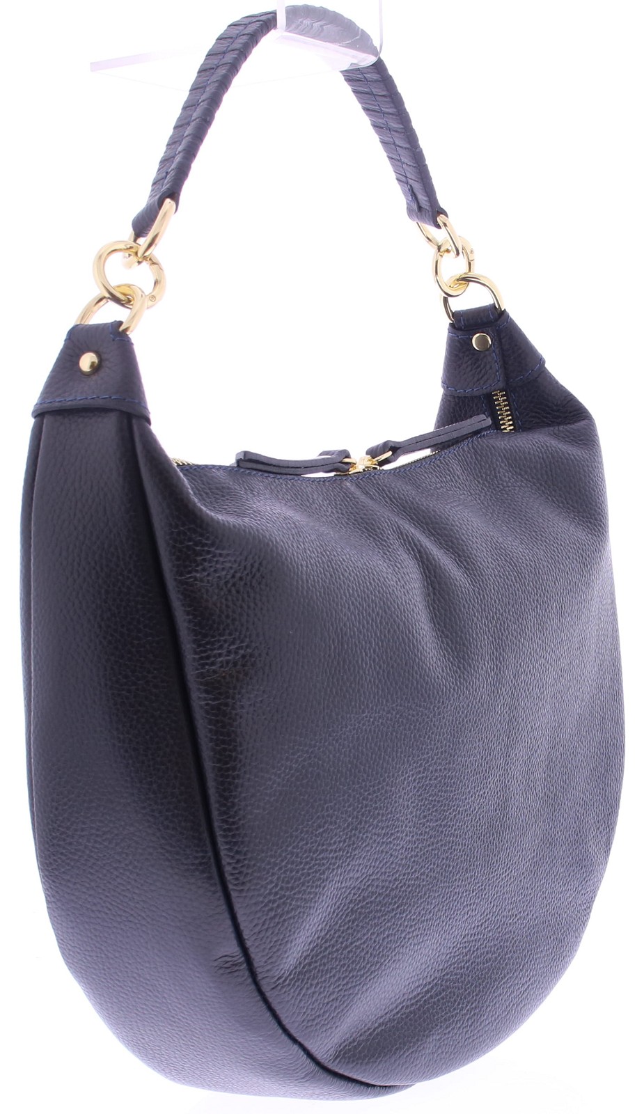 Donkerblauwe leren dames tas van Di Lauro. De afmetingen zijn 32x24x8. Het leer heeft een hele fijne structuur. Grain leer genoemd. Het schouderhengsel is van gevlochten leer gemaakt en heeft aan beide kanten gouden garneringen. De tas sluit met een rits. De lopers van de goudkleurige rits zijn voorzien van hetzelfde blauwe leer. De voering is van stof en heeft naast het grote vak ook zijvakjes.