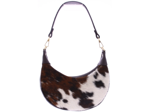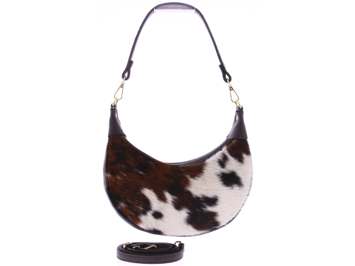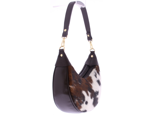 Bruin met beige pony koeienprint dames tas van Di Lauro. Uitgevoerd in leer aan de zijkanten en onderkant en pony koeienprint materiaal aan de voorkant. De afmetingen zijn 33x22x10. Het schouderhengsel is van leer en afgewerkt met goudkleurige garneringen. De tas sluit met een ritssluiting.