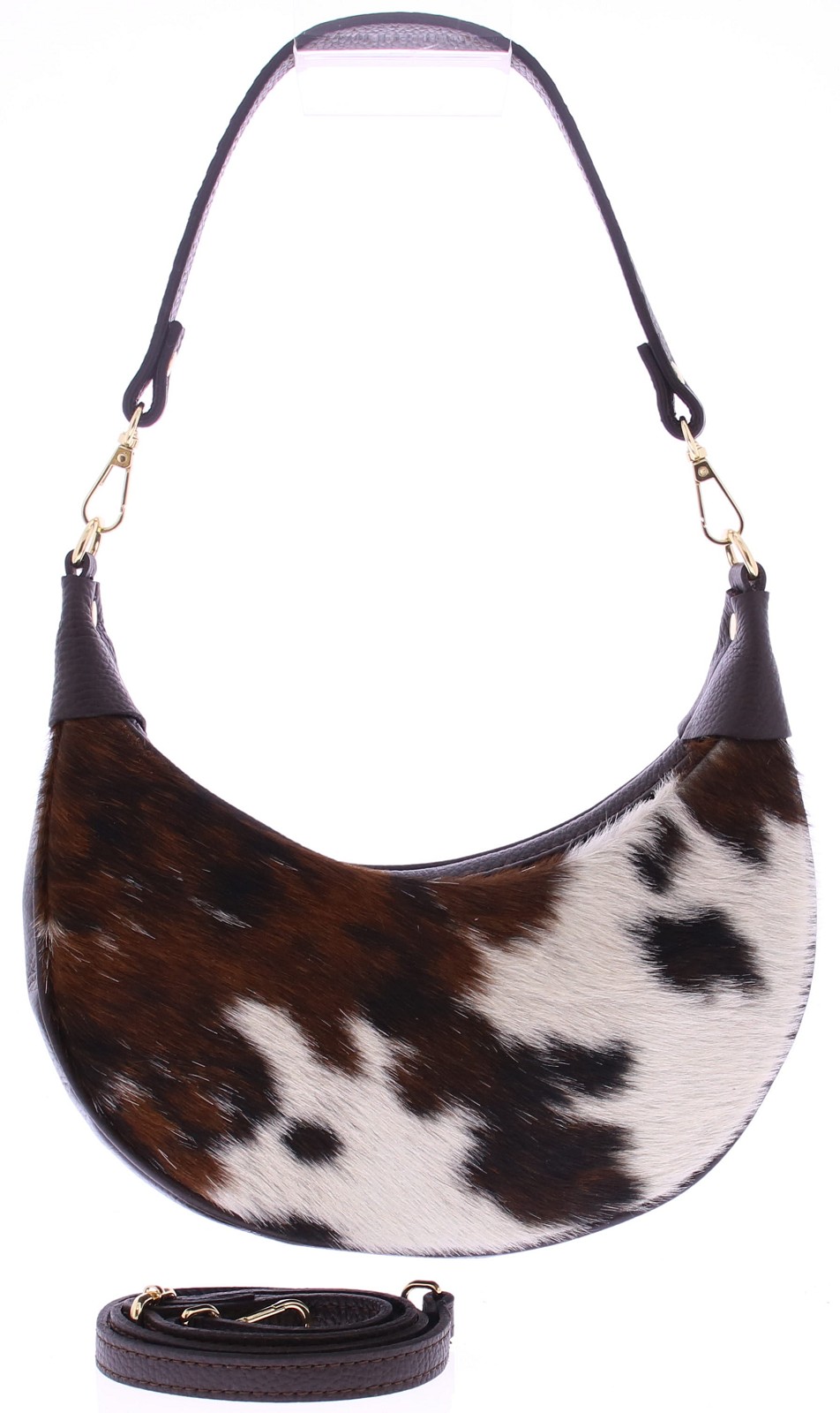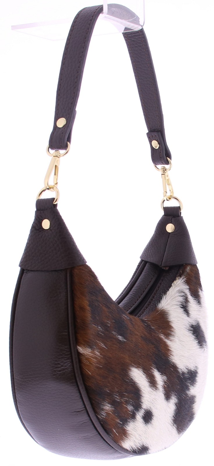 Bruin met beige pony koeienprint dames tas van Di Lauro. Uitgevoerd in leer aan de zijkanten en onderkant en pony koeienprint materiaal aan de voorkant. De afmetingen zijn 33x22x10. Het schouderhengsel is van leer en afgewerkt met goudkleurige garneringen. De tas sluit met een ritssluiting.