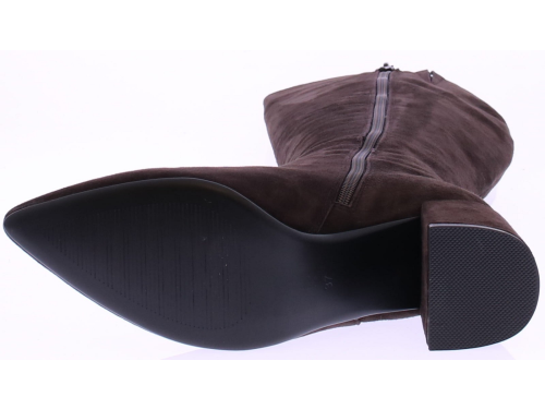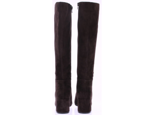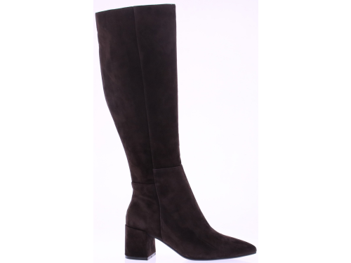 Donkerbruin suede lange dames laars van Di Lauro. De Di Lauro Beatrice laars heeft een rits aan de binnenkant. De leest is vrouwelijk spits maar door te 5 cm blokhak ook wat stoerder. Het voetbed is van leer en hij heeft een dunne rubberen zool.