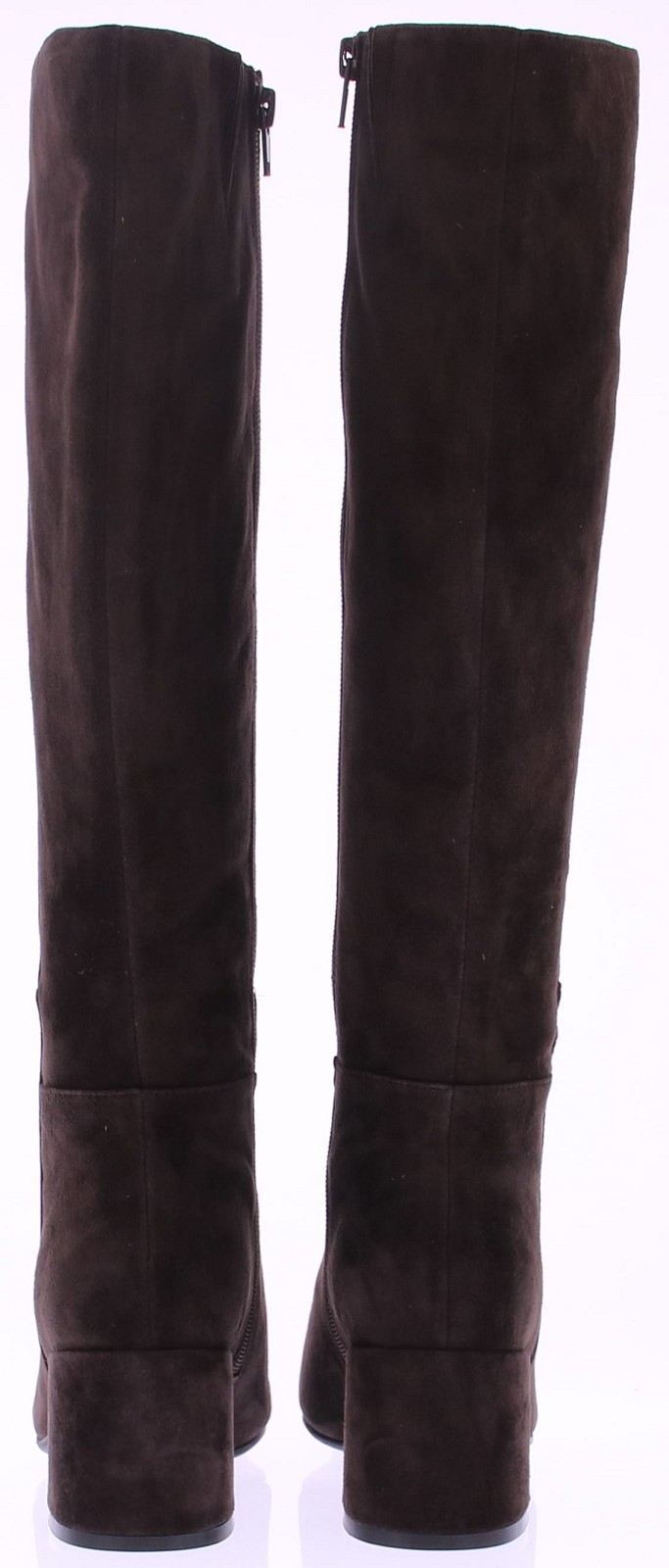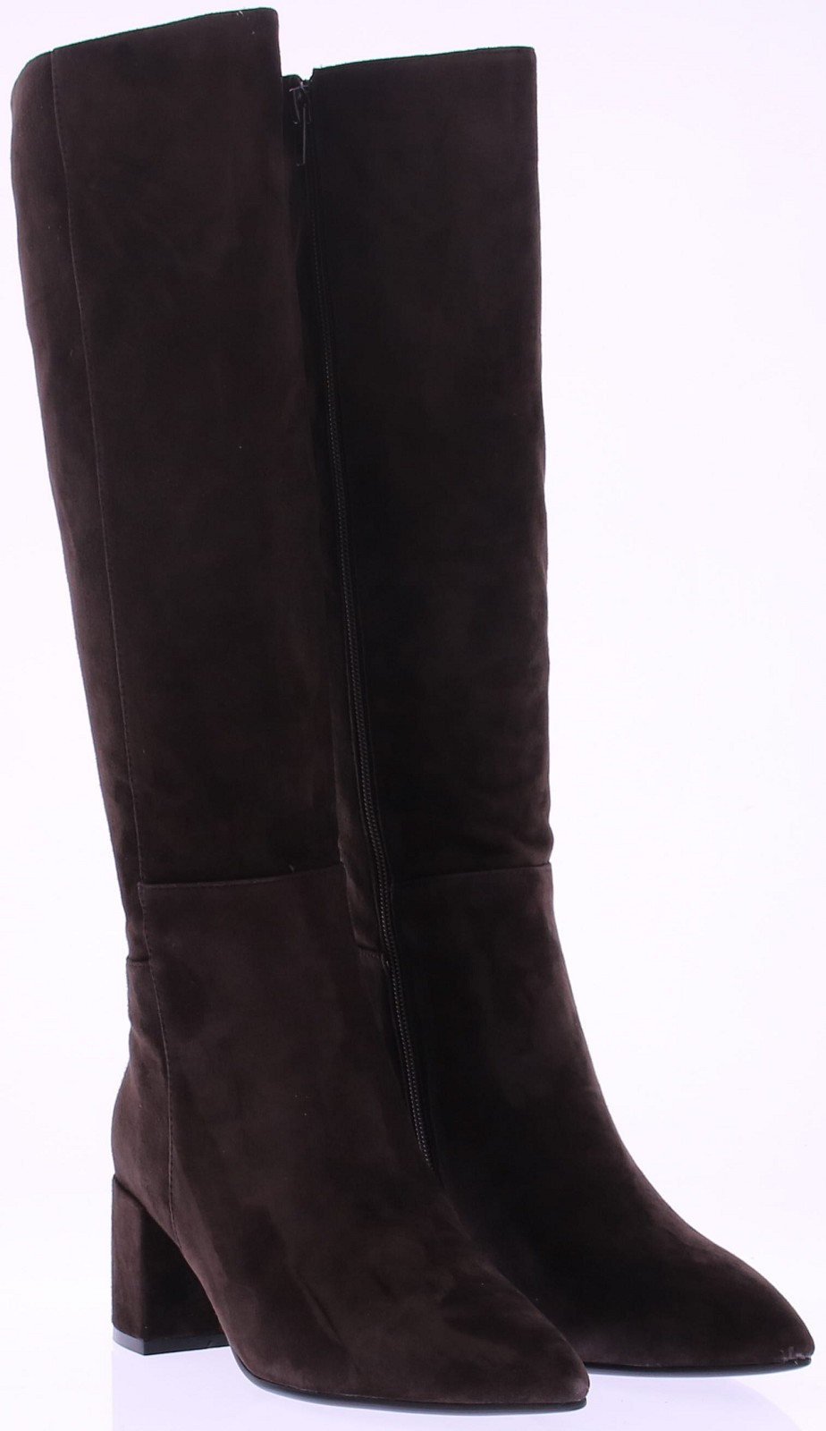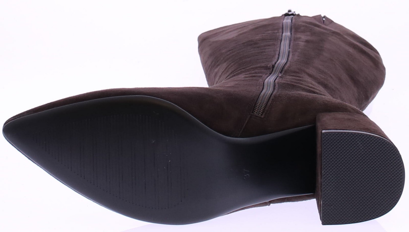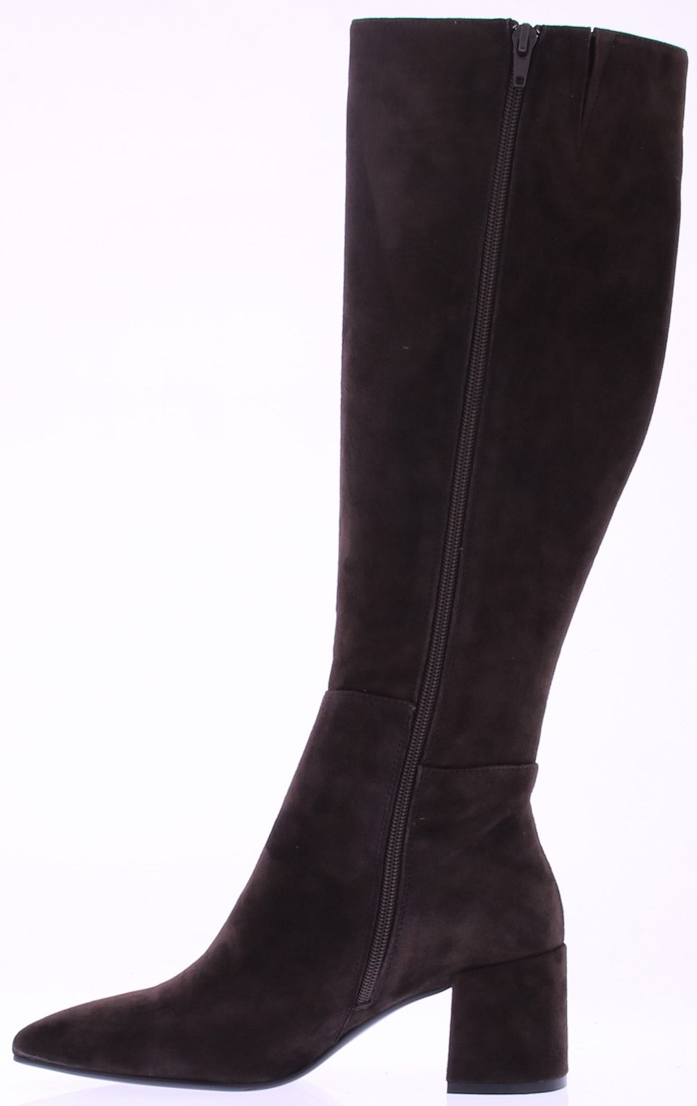 Donkerbruin suede lange dames laars van Di Lauro. De Di Lauro Beatrice laars heeft een rits aan de binnenkant. De leest is vrouwelijk spits maar door te 5 cm blokhak ook wat stoerder. Het voetbed is van leer en hij heeft een dunne rubberen zool.