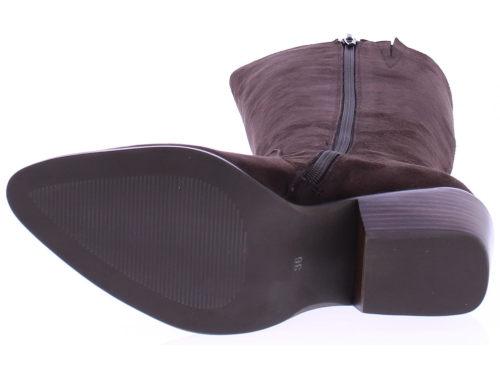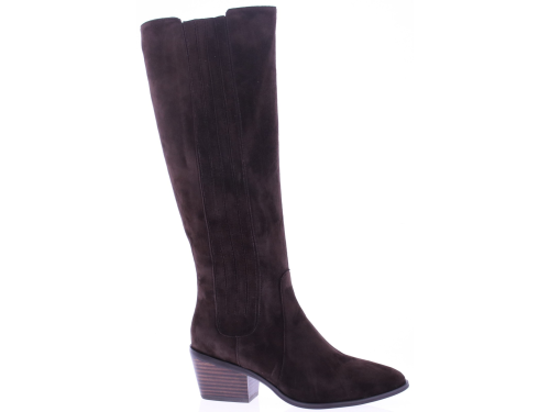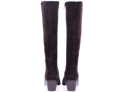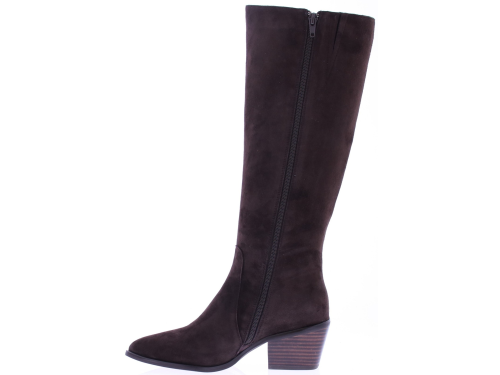 Donkerbruin suede lange dames laars van Di Lauro. De laars Nayla heeft een rits aan de binnenkant en een beklede elastieke banen aan de buitenkant. De wat spitsere leest is wat stoerder ook door de zoolrand en schuine blokhak van 5 cm. Het voetbed is van leer en hij heeft een rubberen zool.