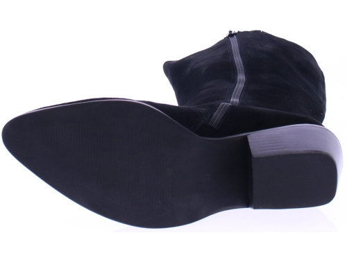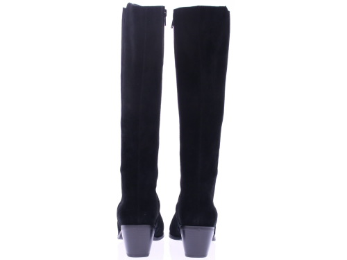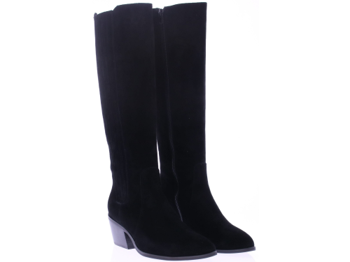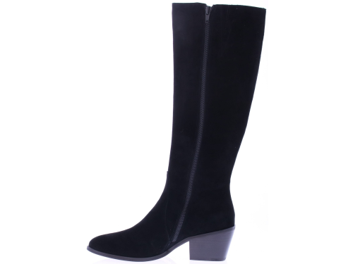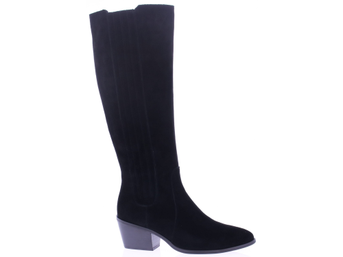 Zwart suede lange dames laars van Di Lauro. De laars model Nayla heeft een rits aan de binnenkant en een beklede elastieke banen aan de buitenkant. De wat spitsere leest is wat stoerder ook door de zoolrand en schuine blokhak van 5 cm. Het voetbed is van leer en hij heeft een rubberen zool.