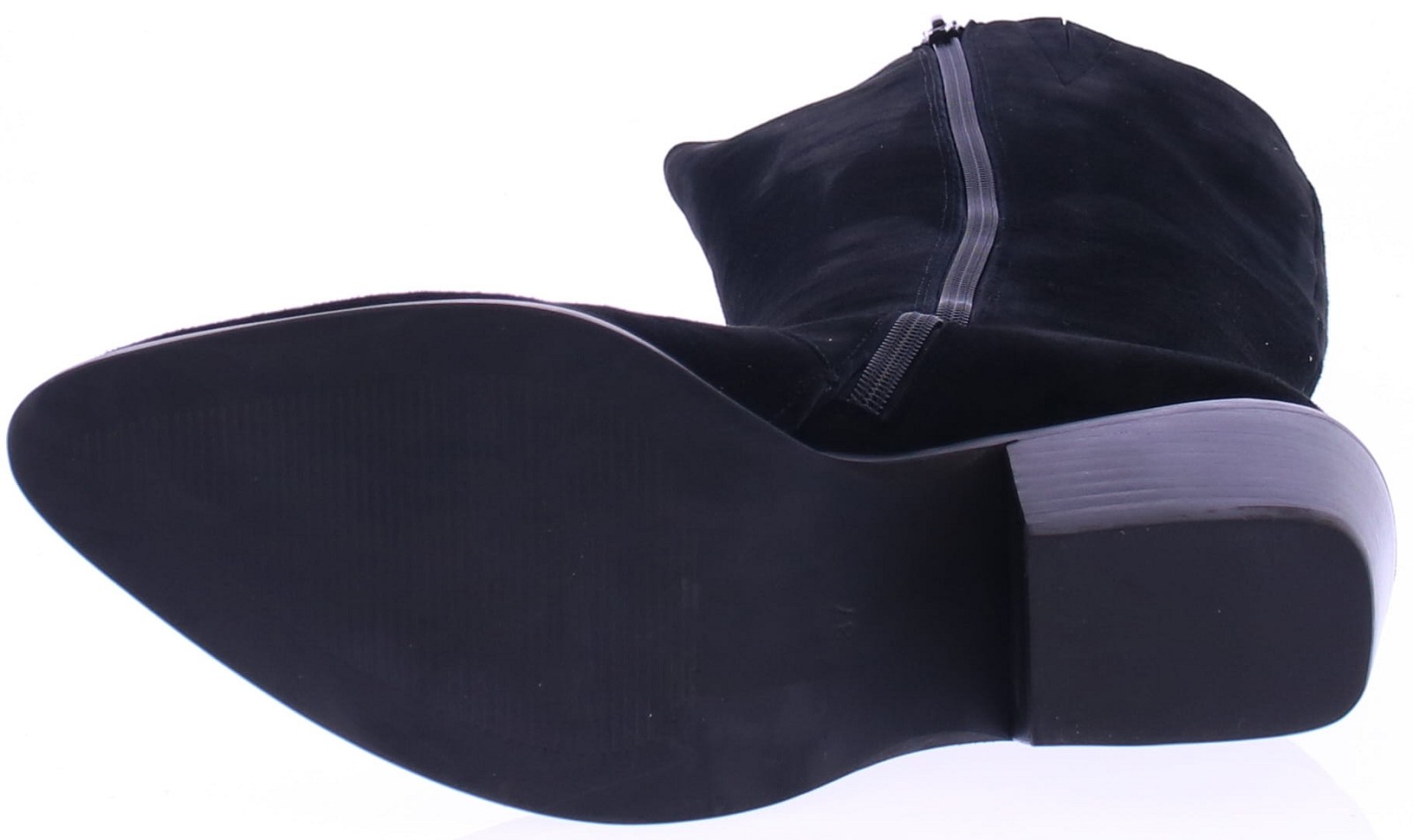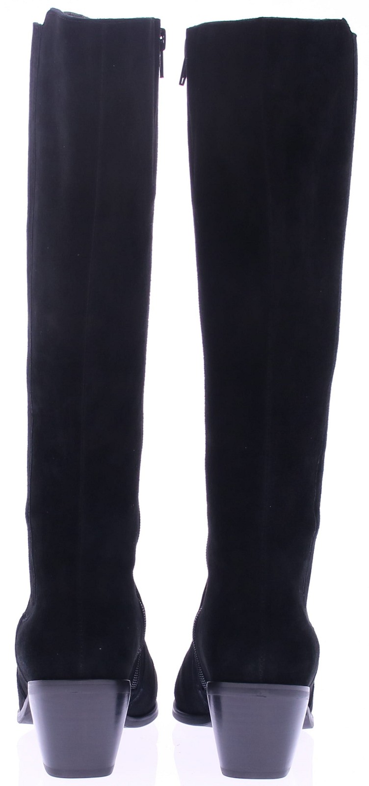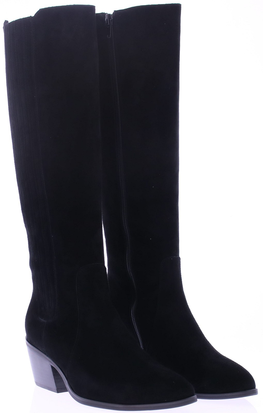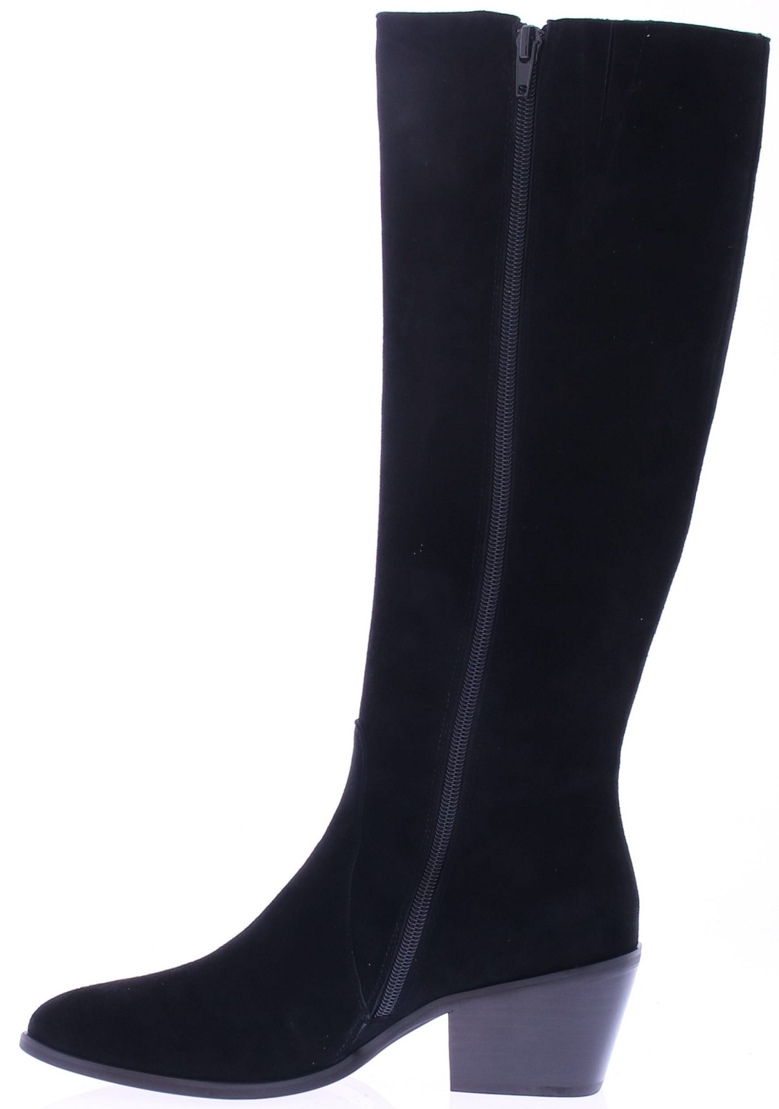 Zwart suede lange dames laars van Di Lauro. De laars model Nayla heeft een rits aan de binnenkant en een beklede elastieke banen aan de buitenkant. De wat spitsere leest is wat stoerder ook door de zoolrand en schuine blokhak van 5 cm. Het voetbed is van leer en hij heeft een rubberen zool.