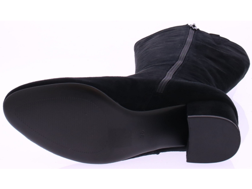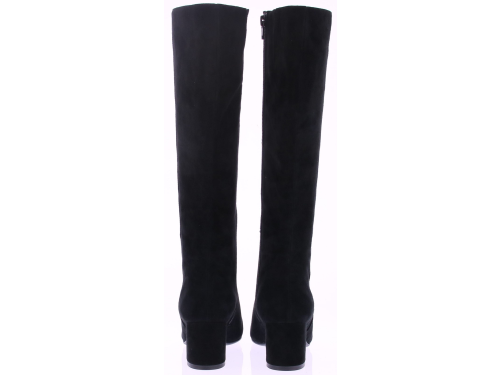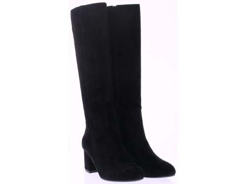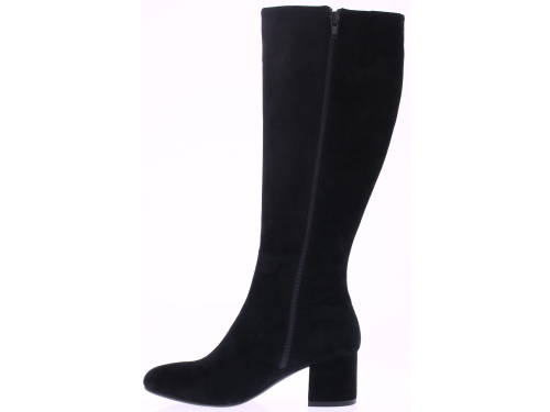 Zwart suede lange dames laars van Di Lauro. De laars heeft een rits aan de binnenkant. De leest is ovaal en de comfortabele blokhak is 5 cm hoog. Het voetbed is van leer en hij heeft een rubberen zool.