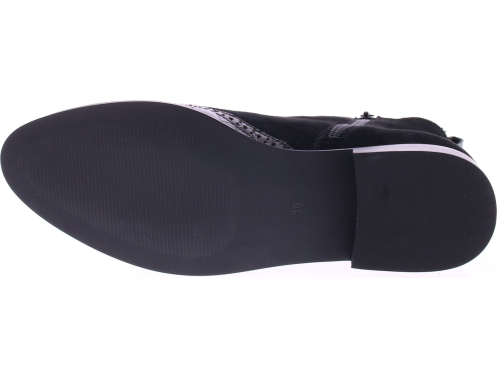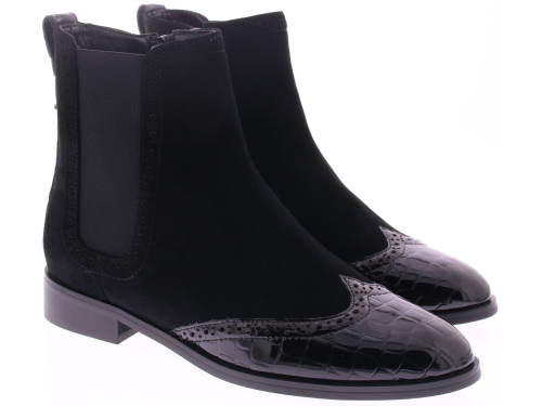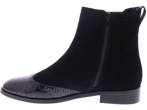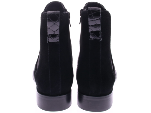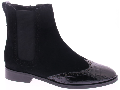 Zwarte dames Chelsea enkellaars van Di Lauro. Uitgevoerd in verfijnd suede met op de neus zwart lak met een crocoprint. Aan de binnenkant zit een rits, de voering is van leer en de zool van rubber. Een perfecte schoen voor wie net dat beetje extra flair wil toevoegen aan een klassieke look.