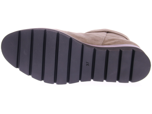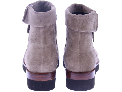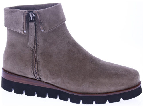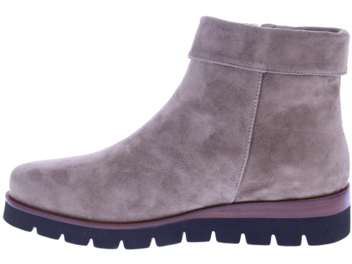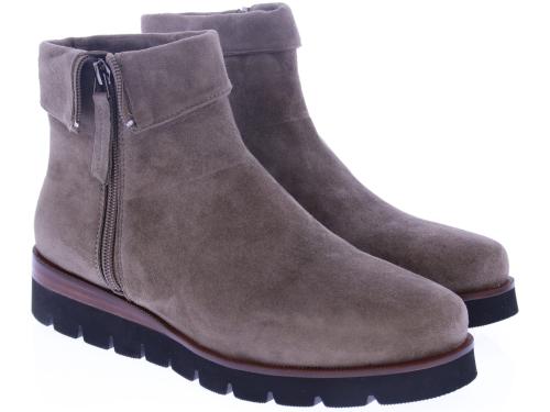 Taupe suede dames enkellaars Nanet van Di Lauro. Comfortabele en stijlvolle korte laars met aan de buitenkant de rits die door loopt t/m het omslagje, wat ook omhoog te dragen is. De oplopende sportieve zool is van rubber met een leren inzet wat hem net dat leuke detail geeft. Het tijdloze design maakt van dit laarsje een basis voor in elke kast.