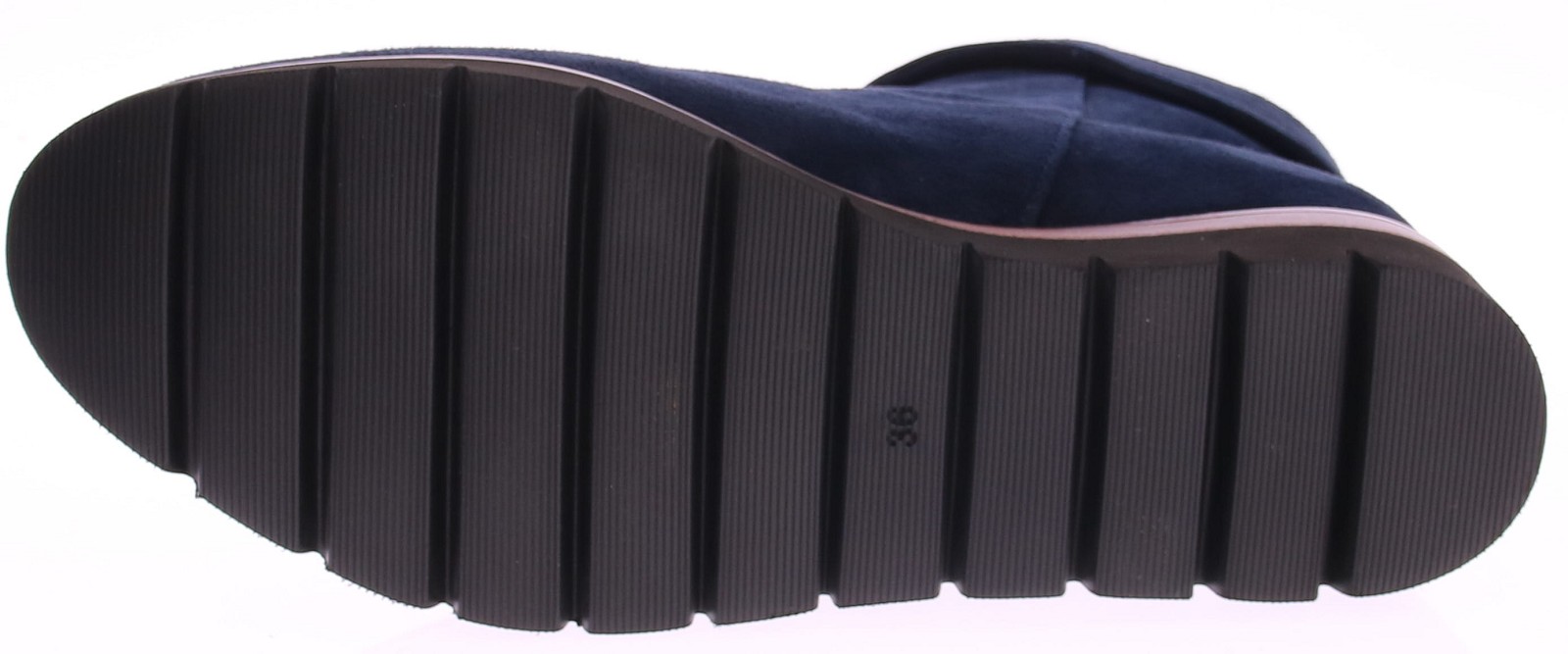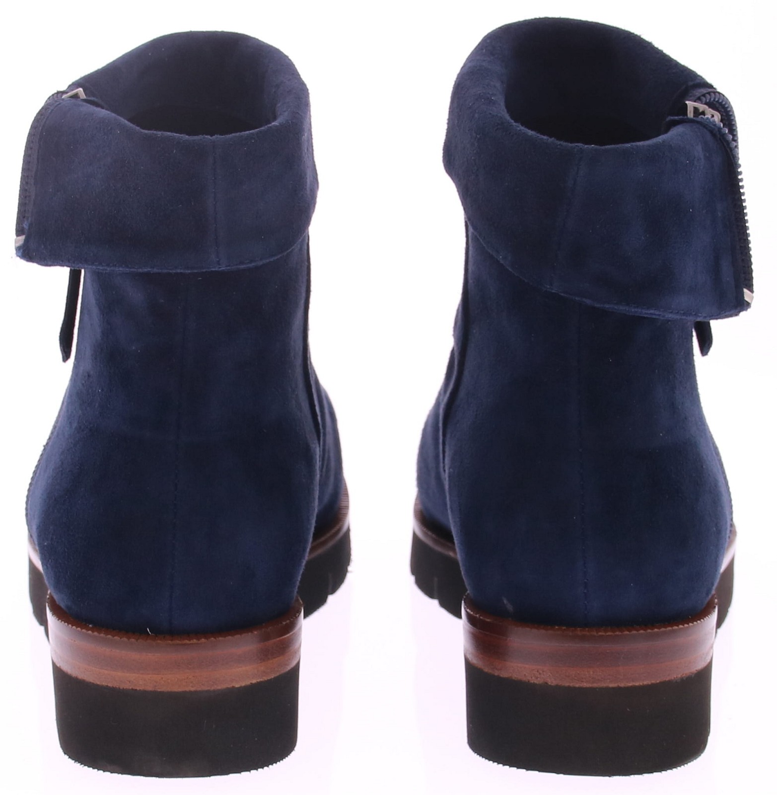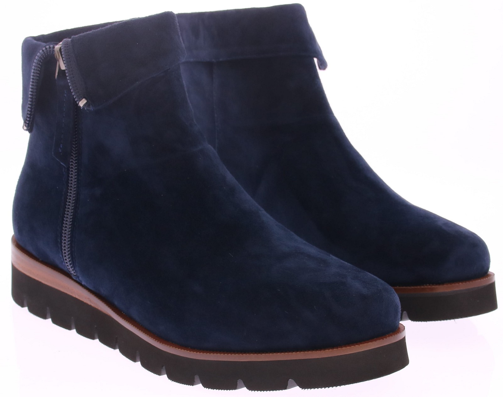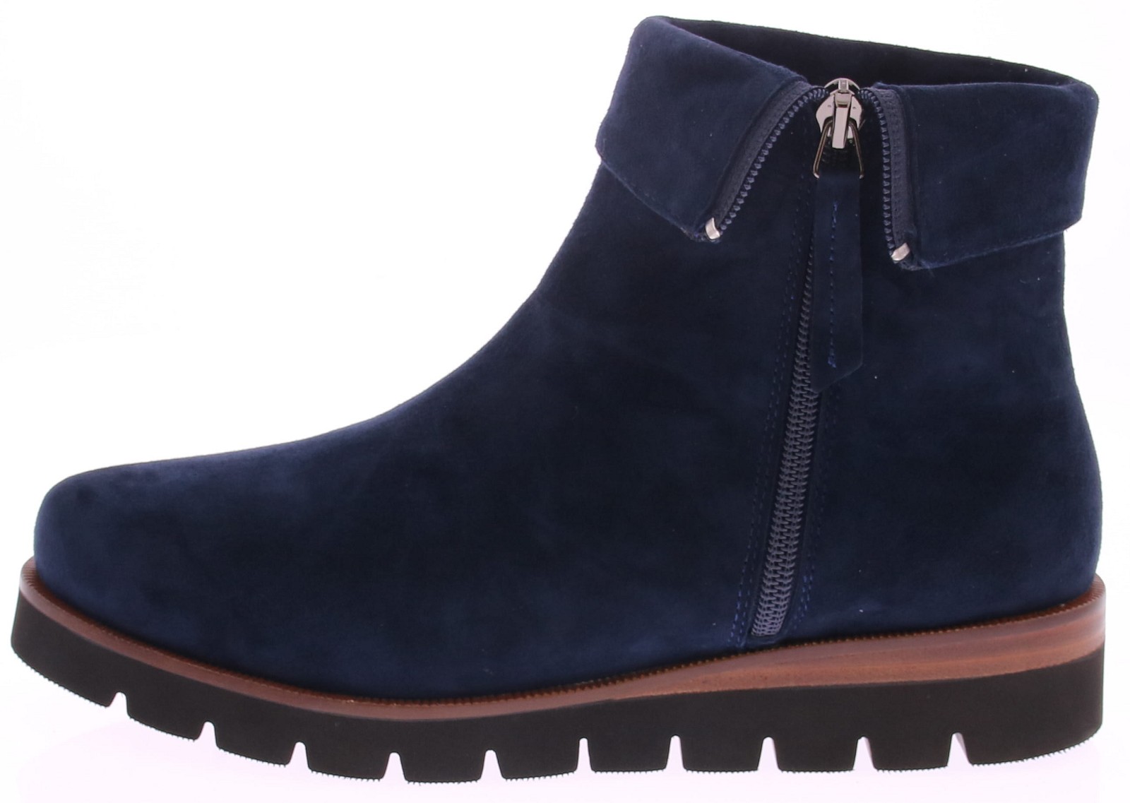 Donkerblauw suede dames enkellaars Nanet van Di Lauro. Comfortabele en stijlvolle korte laars met aan de buitenkant de rits die door loopt t/m het omslagje, wat ook omhoog te dragen is. De oplopende sportieve zool is van rubber met een leren inzet wat hem net dat leuke detail geeft. Het tijdloze design maakt van dit laarsje een basis voor in elke kast.