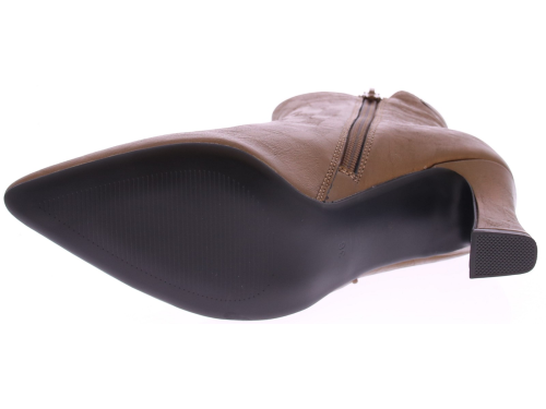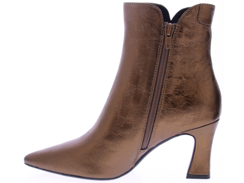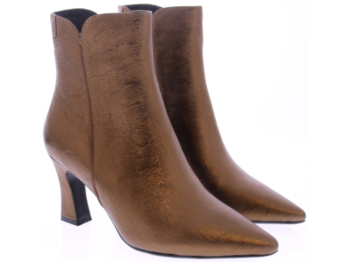 Bronskleurige leren dames enkellaars Sterre 2 van Di Lauro. Deze vrouwlijke enkellaars met 7 cm hak is een echte eyecatcher. Het slanke model met de spitse neus en elegante hak straalt pure klasse uit. De subtiele print in het leer geeft een luxe uitstraling, perfect voor zowel werk als feestelijke gelegenheden. De laars sluit mooi aan om de enkel en biedt dankzij de stabiele hak toch aangenaam loopcomfort.