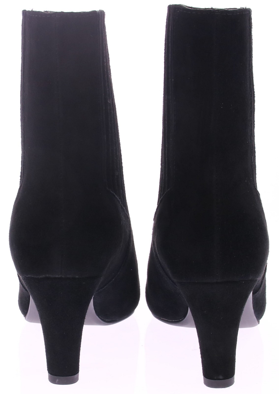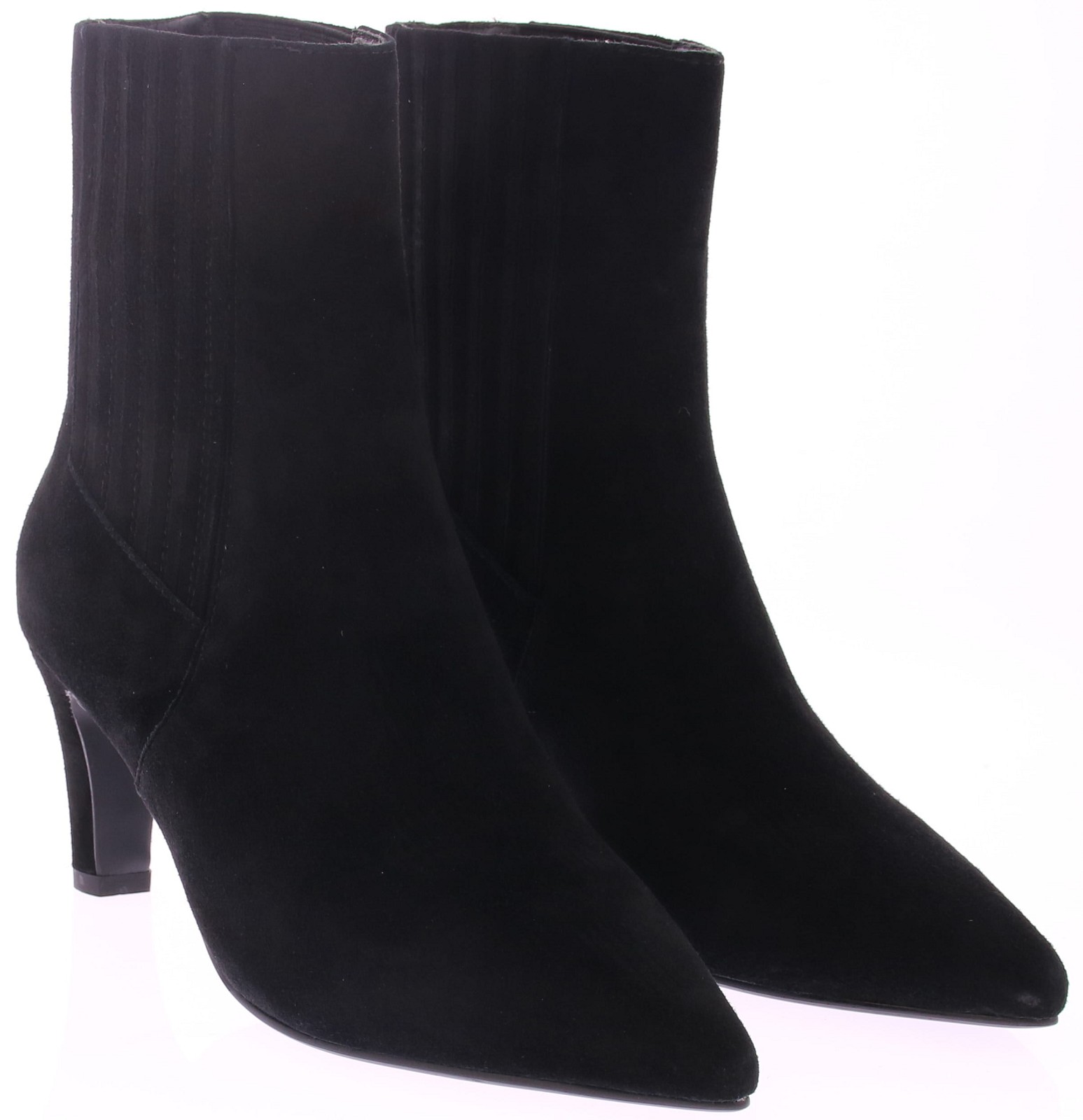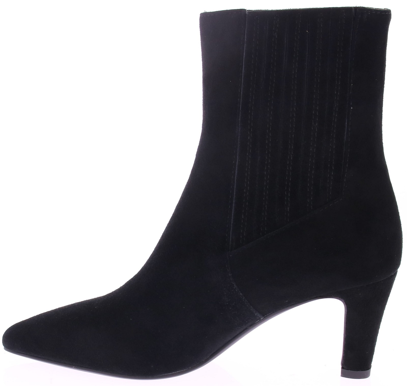 Zwart suede dames enkellaars Calandra van Di Lauro. Deze elegante enkellaars heeft een spitse neus, een slanke hak van 6 cm en subtiel met suede beklede elastische inzetstukken aan de zijkant.