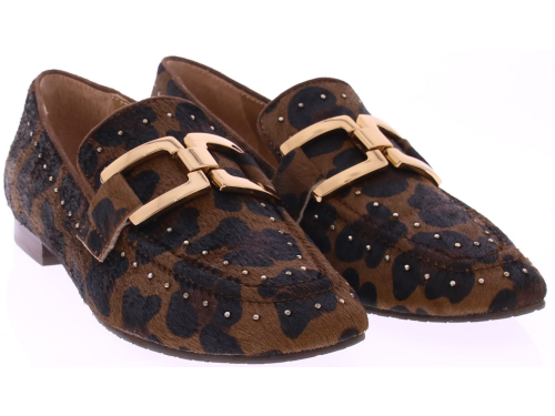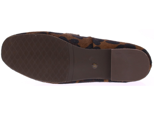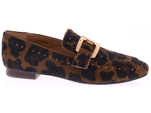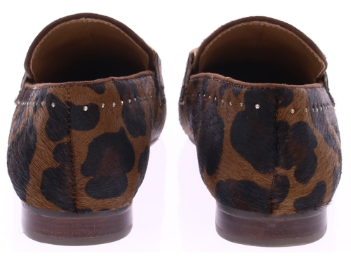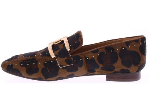 Donkerbruin luipaardprint pony haar dames instapper van Di Lauro. Deze instapper met een ovale leest heeft op de wreef een goudkleurige bit en heeft rondom de schoen leuke studs. Dit model is leer gevoerd, met een vast voetbed, en heeft een kunststof zool en een lage hak van 2 centimeter. Met deze mooie loafer geef je ieder outfit een chique uitstraling!