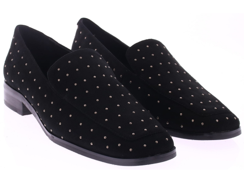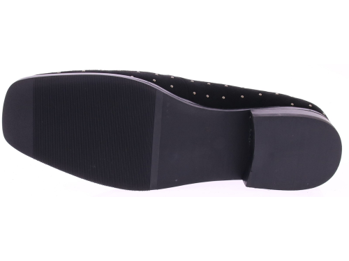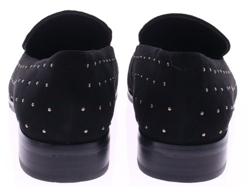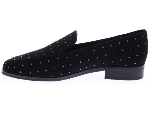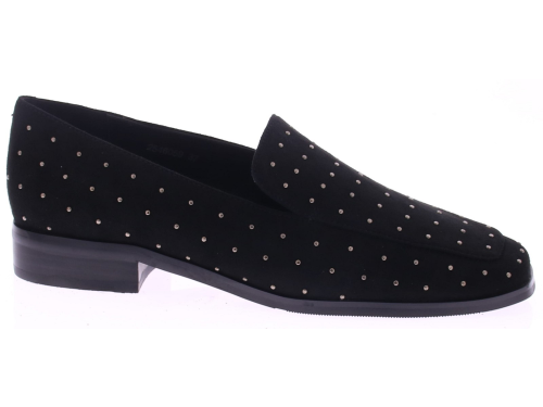 Zwart suéde dames instapper van Di Lauro. Deze instapper heeft op de schoen leuke zilvere studs. Een leuke loafer met leren voering en een hakhoogte van 2 cm.