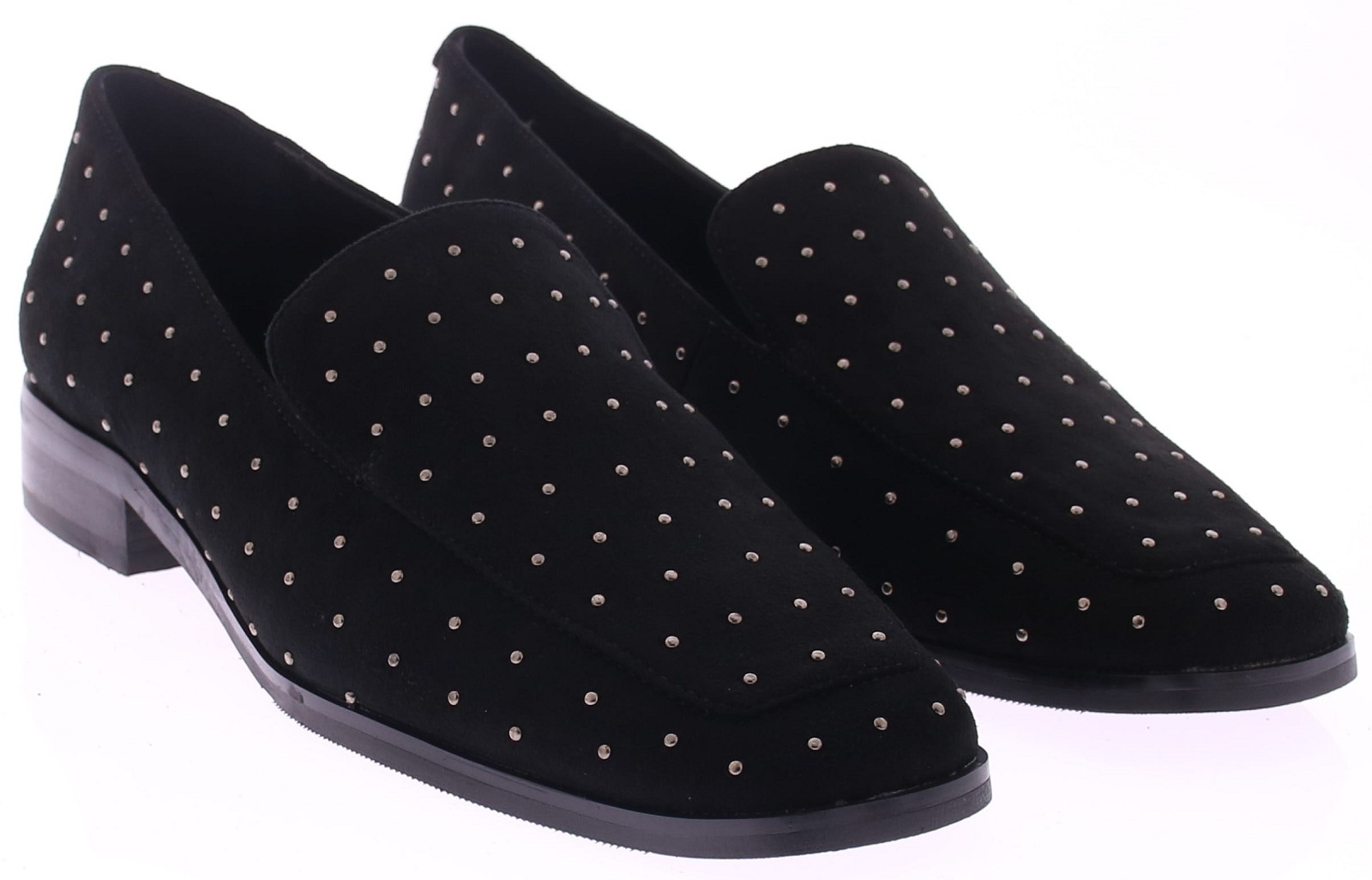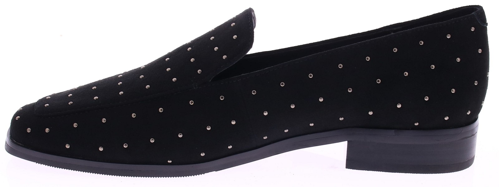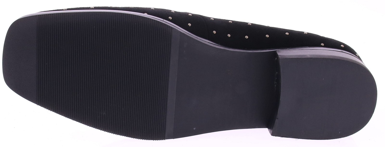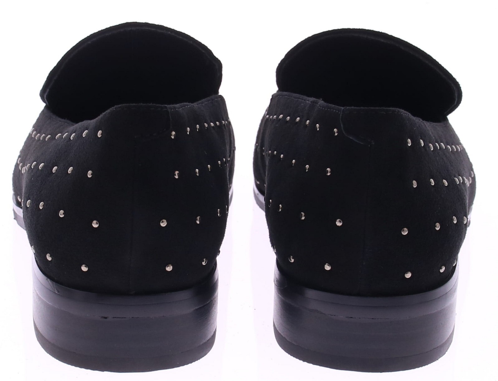 Zwart suéde dames instapper van Di Lauro. Deze instapper heeft op de schoen leuke zilvere studs. Een leuke loafer met leren voering en een hakhoogte van 2 cm.
