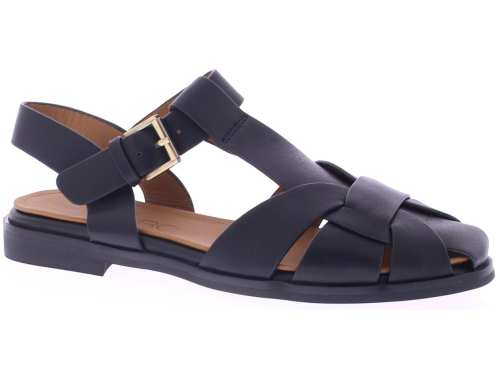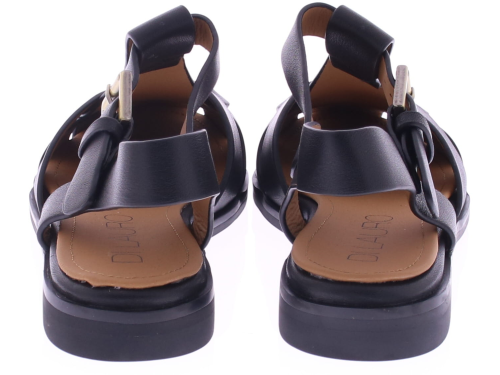 Zwarte leren dames sandalen van Di Lauro, model Daniela. Deze sandaal heeft een dichte voorkant en een open hiel met een goudkleurig gespje. De hak is 2 cm hoog en de zwarte rubberen zool biedt stevige grip en prettig loopcomfort. Gemaakt van soepel leer en geschikt voor zowel dagelijks gebruik als nette gelegenheden.