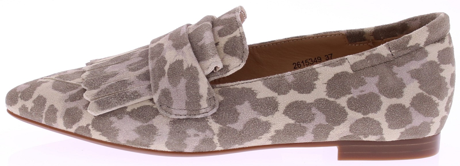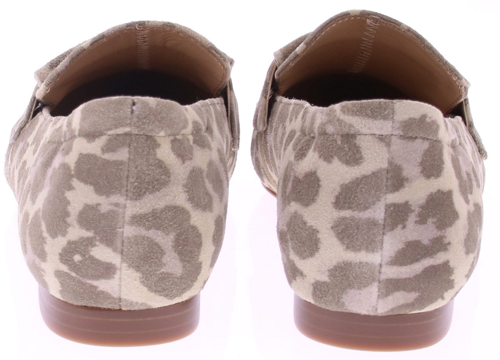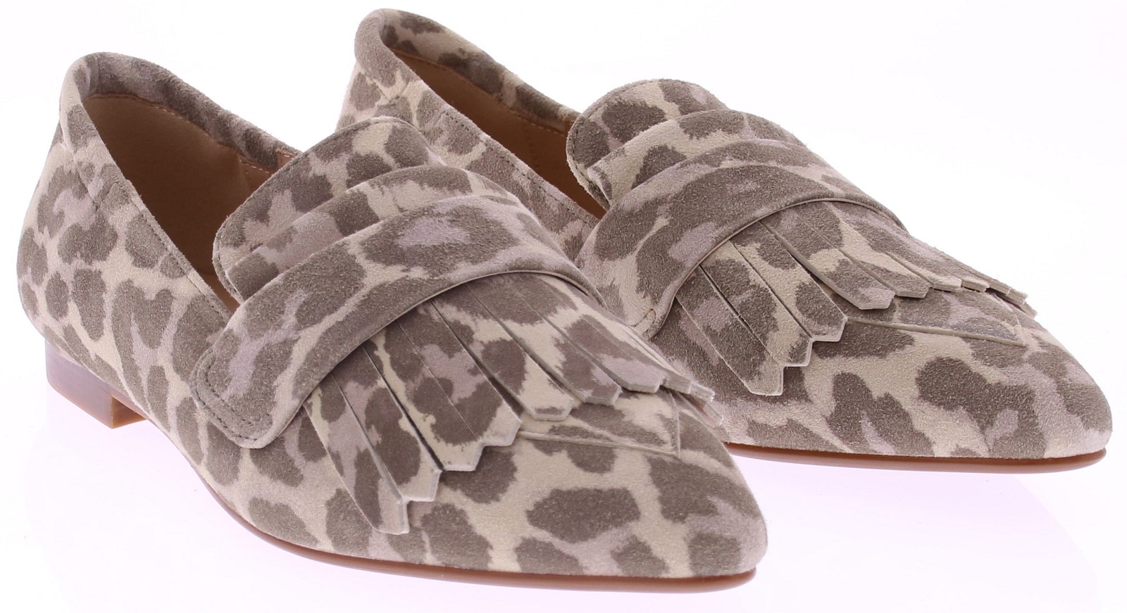 Suède dames instappers van Di Lauro model Dasia met een vervaagde panterprint. Deze instapper heeft een jamboreeklep en een spitse neus. Het soepele suède en de subtiele print geven de schoen een modieuze uitstraling. Perfect te combineren met zowel een casual broek als een zomerse jurk.
