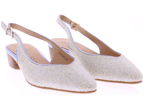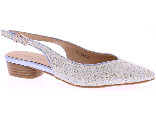 Lichtblauw metallic print dames slingback pumps van Di Lauro, model Danila. Deze slingback pump heeft een spitse neus. De open hiel is voorzien van een verstelbaar gespje voor een goede pasvorm. De hak is 3 cm hoog en de rubberen zool zorgt voor stevige grip en prettig loopcomfort. Een stijlvolle pump die past bij zowel zomerse als formele outfits.