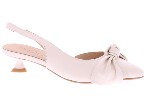 Roomkleurige leren dames slingback pumps van Di Lauro, model Danae. Deze pump heeft een queeniehak met een hakhoogte van 3 cm en een hielband met elastiek zodat deze goed om de voet aansluit. Op de voorvoet bevindt zich een leren strik dat het geheel een verfijnde uitstraling geeft. Gemaakt van soepel leer en geschikt voor zowel dagelijks gebruik als feestelijke gelegenheden.