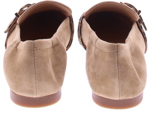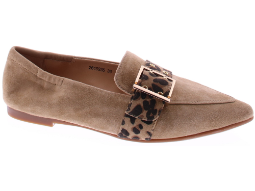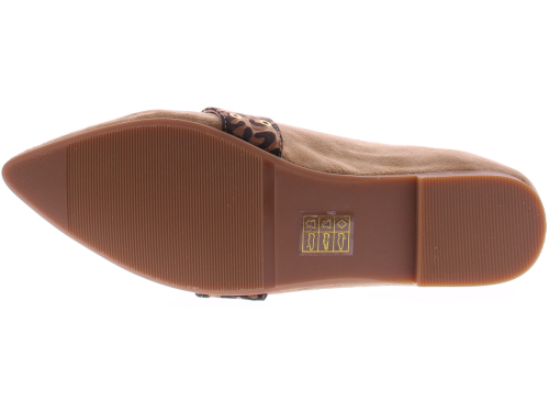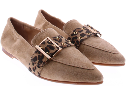 Lichtbruine suède dames instappers van Di Lauro, model Diomira. Deze instapper heeft een spitse neus en is voorzien van een brede band met panterprint en een goudkleurige gesp voor een opvallend accent. In de hiel zit elastiek zodat de schoen mooi aansluit rond de voet. De leren voering zorgt voor prettig draagcomfort en de rubberen zool biedt soepele ondersteuning bij dagelijks gebruik. Een stijlvol en eigentijds model dat eenvoudig te combineren is met zowel denim als een nette pantalon.