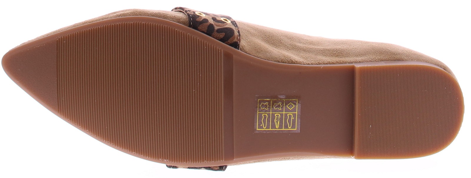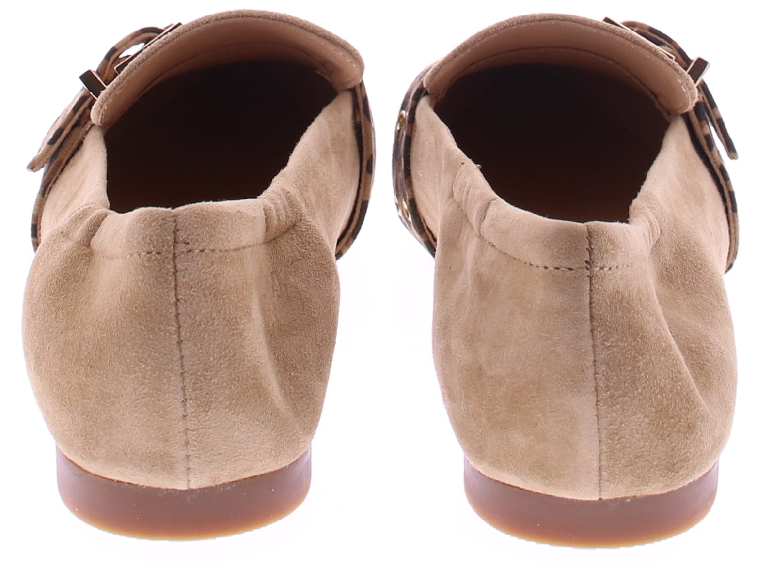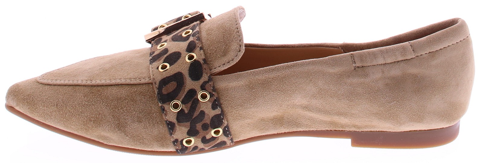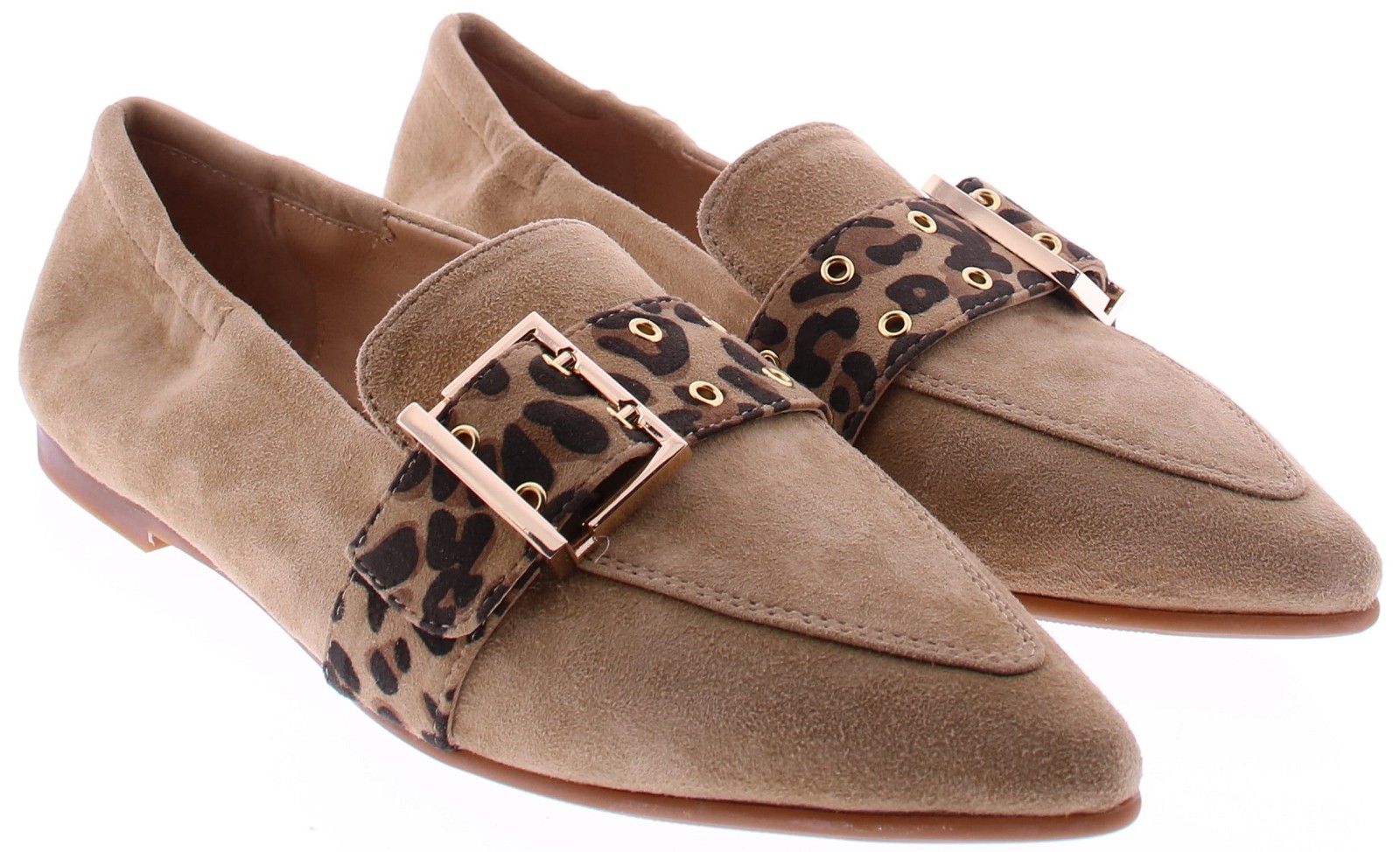 Lichtbruine suède dames instappers van Di Lauro, model Diomira. Deze instapper heeft een spitse neus en is voorzien van een brede band met panterprint en een goudkleurige gesp voor een opvallend accent. In de hiel zit elastiek zodat de schoen mooi aansluit rond de voet. De leren voering zorgt voor prettig draagcomfort en de rubberen zool biedt soepele ondersteuning bij dagelijks gebruik. Een stijlvol en eigentijds model dat eenvoudig te combineren is met zowel denim als een nette pantalon.