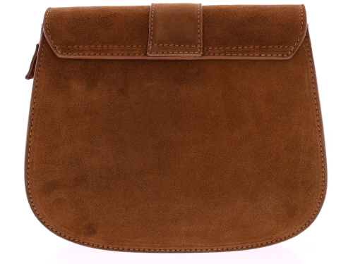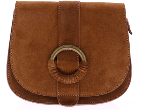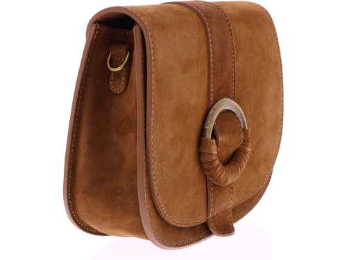 Middenbruin suède dames tas van Di Lauro, model Donna 010. Deze elegante saddlebag is uitgevoerd in zacht suède en afgewerkt met een goudkleurige ring op de klep. De tas sluit gemakkelijk met een magnetische drukknoop en is ideaal om crossbody te dragen dankzij de smalle verstelbare schouderband. Een compact, tijdloos model dat elke outfit een verfijnde en modieuze uitstraling geeft. Ontdek ook de andere dames tassen van Di Lauro bij Klijsen.