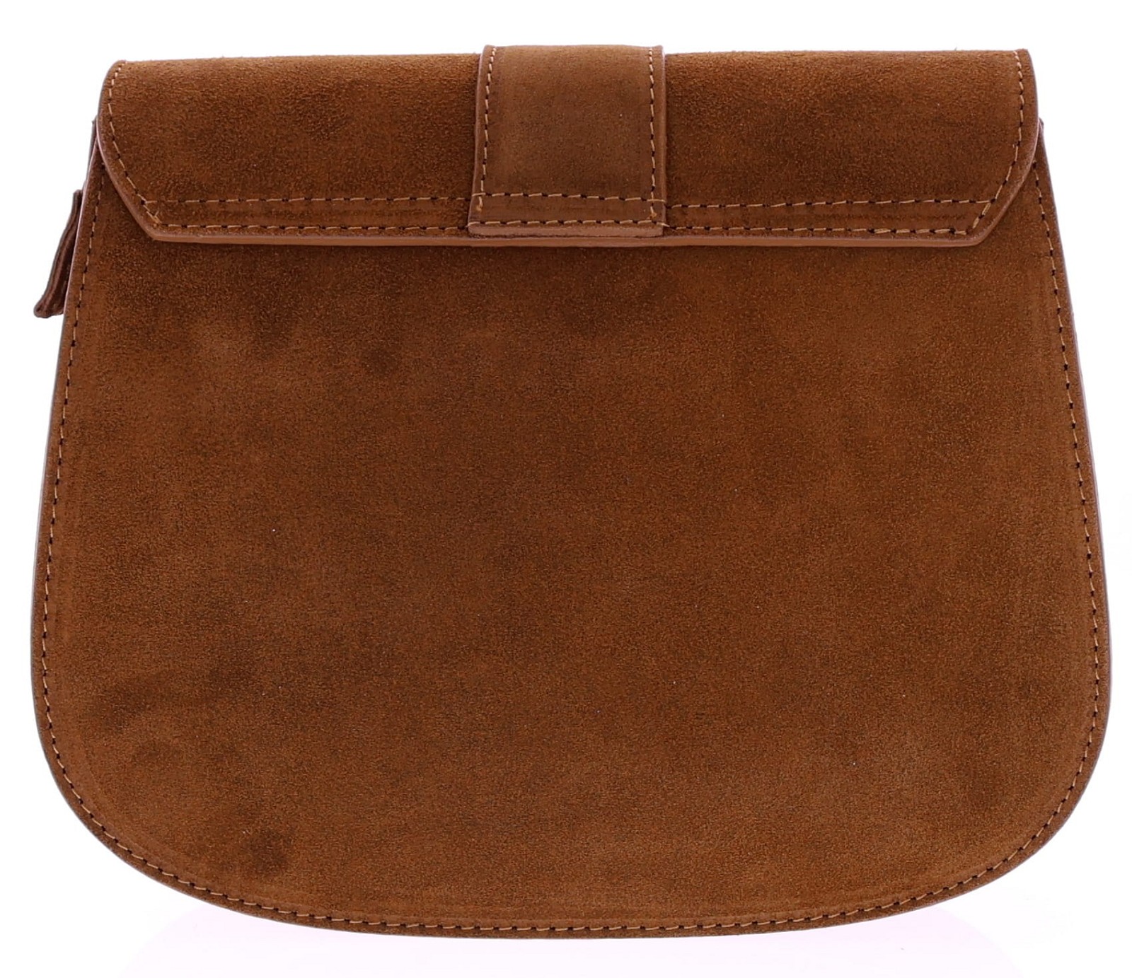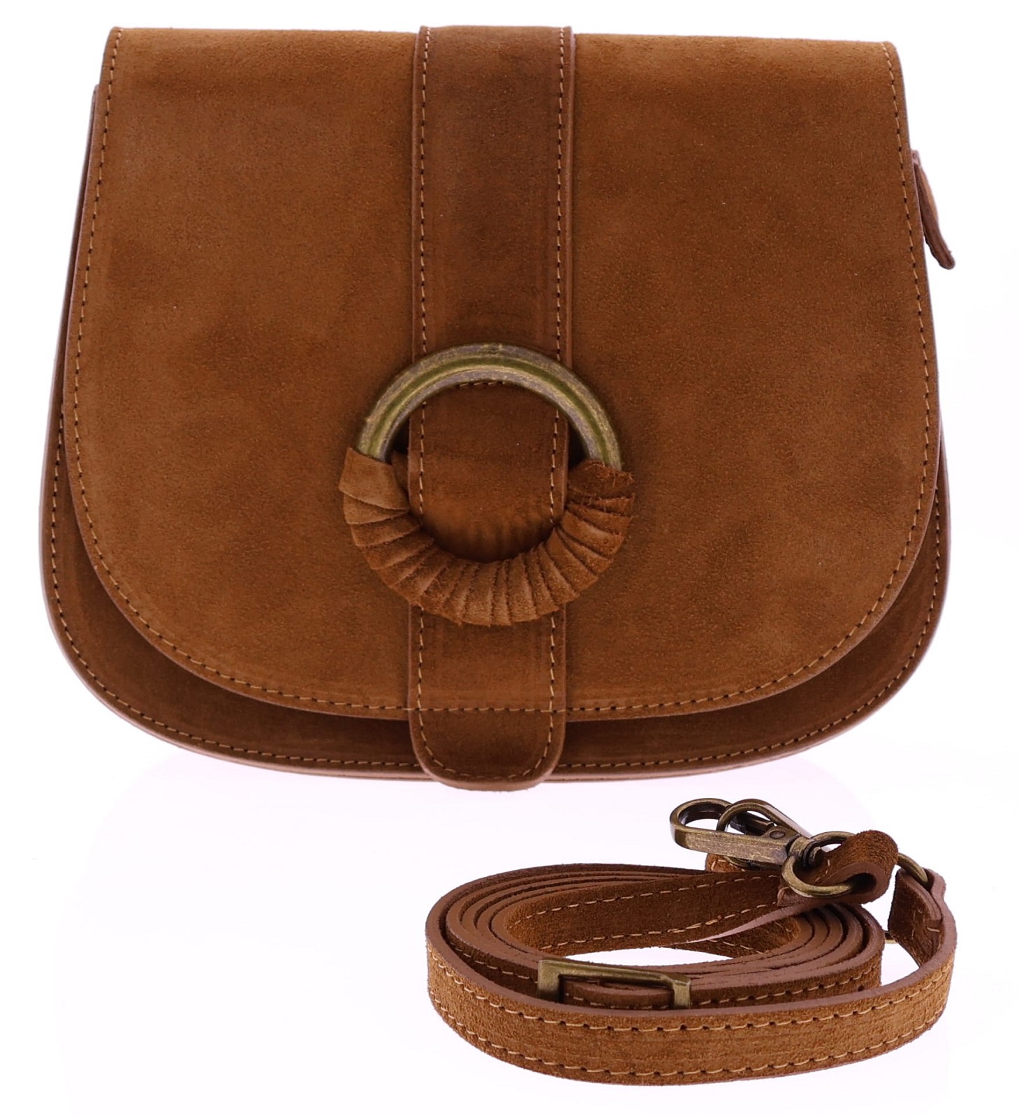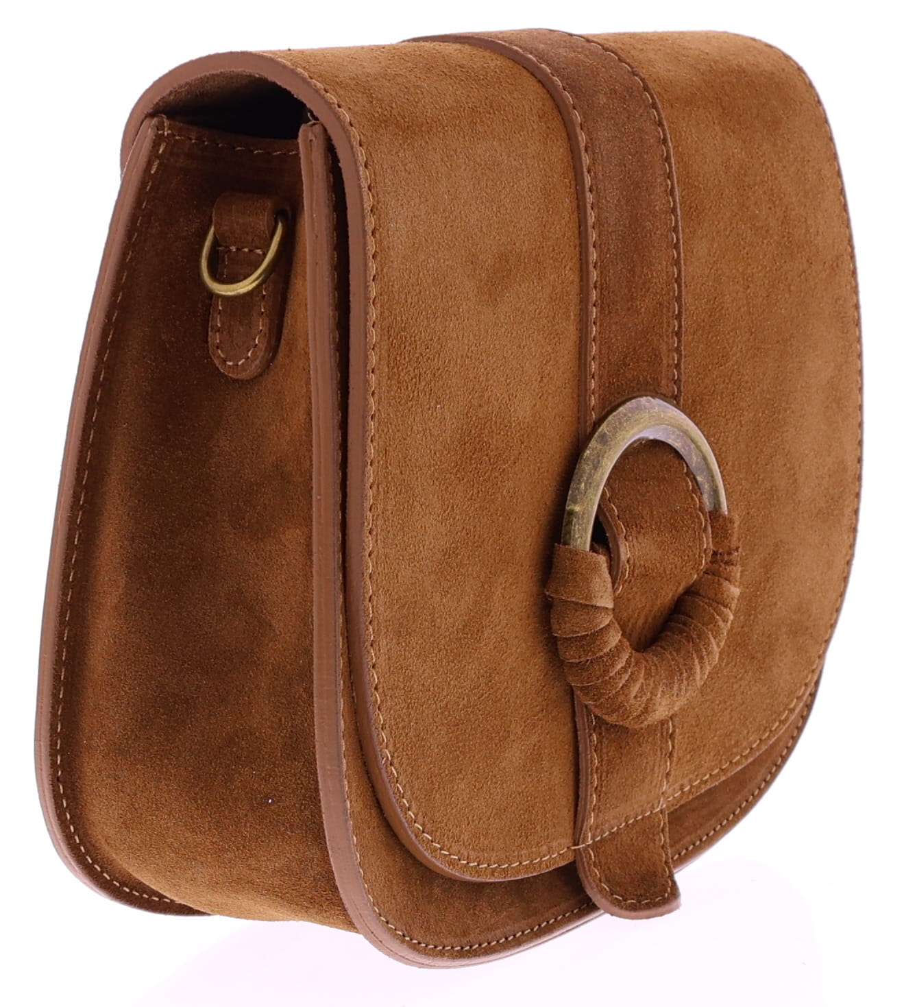 Middenbruin suède dames tas van Di Lauro, model Donna 010. Deze elegante saddlebag is uitgevoerd in zacht suède en afgewerkt met een goudkleurige ring op de klep. De tas sluit gemakkelijk met een magnetische drukknoop en is ideaal om crossbody te dragen dankzij de smalle verstelbare schouderband. Een compact, tijdloos model dat elke outfit een verfijnde en modieuze uitstraling geeft. Ontdek ook de andere dames tassen van Di Lauro bij Klijsen.