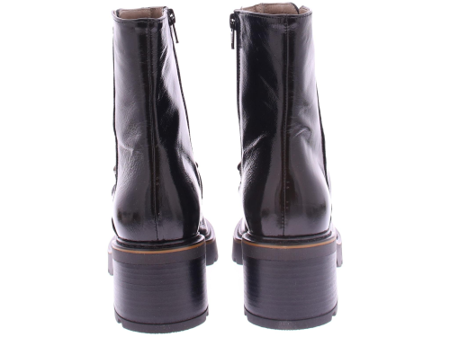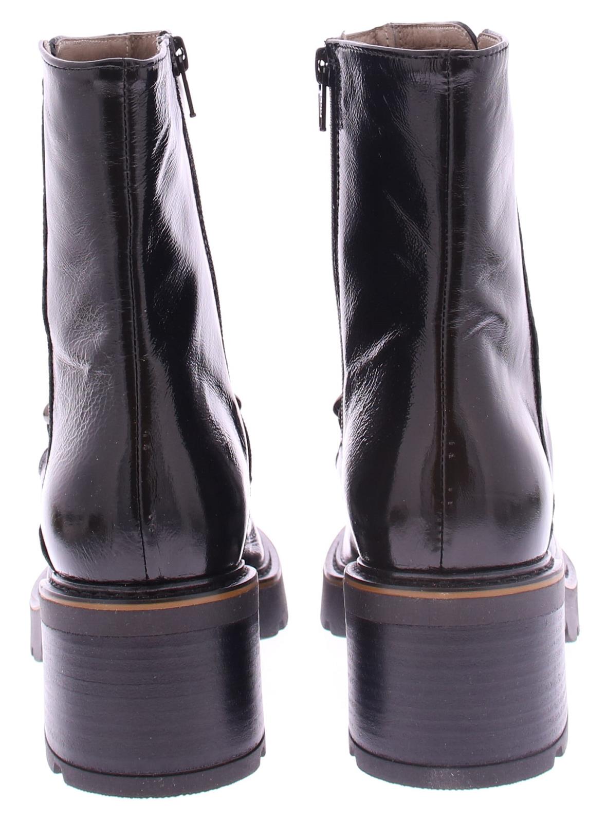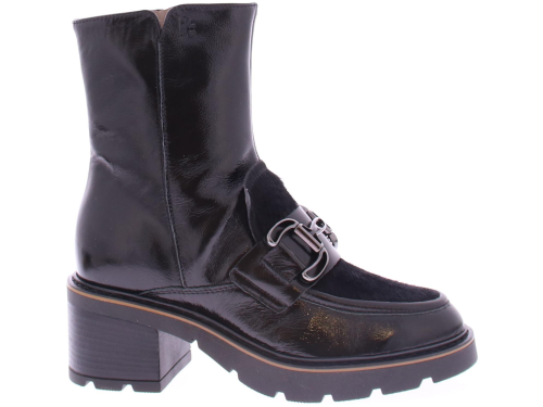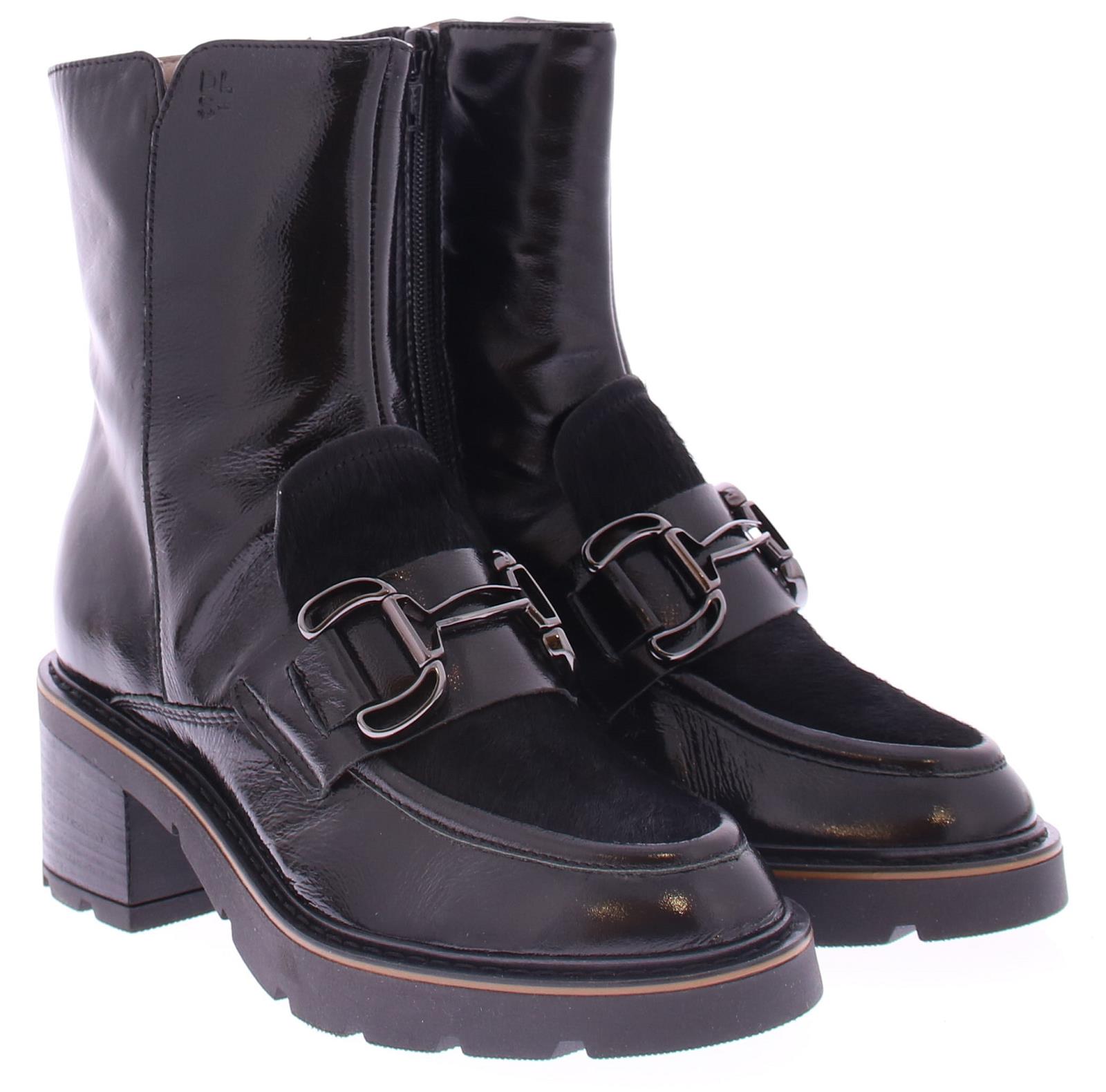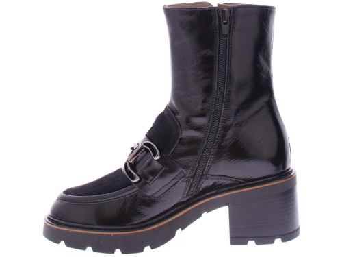 |Zwarte lak dames Laars van DL Sport. Deze vrouwelijke sportieve laars heeft een inzet van zwart pony-haar met een sierlijke zwarte bit. Langs de zool loopt een donkerbruine leren rand. Dit model heeft een grof rubberen loopzool met een hakhoogte van 4 cm.
