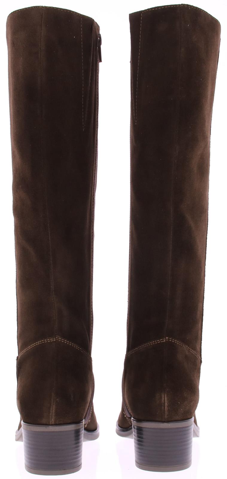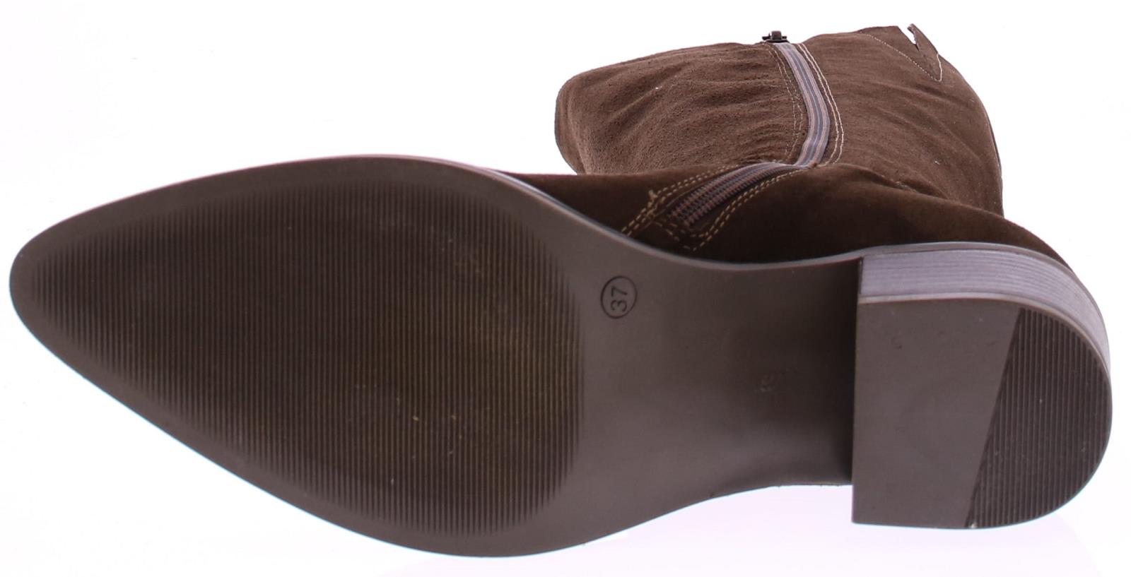 Donkerbruin suede hoge dames laarzen van DL Sport. Deze mooie basic lange laars heeft een soepele zool en rits. Het schuine hakje is 4 cm hoog. Deze comfortabele city western laars is goed te combineren over een broek of stoerder onder een jurkje. Het voetbed is eventueel uitneembaar.