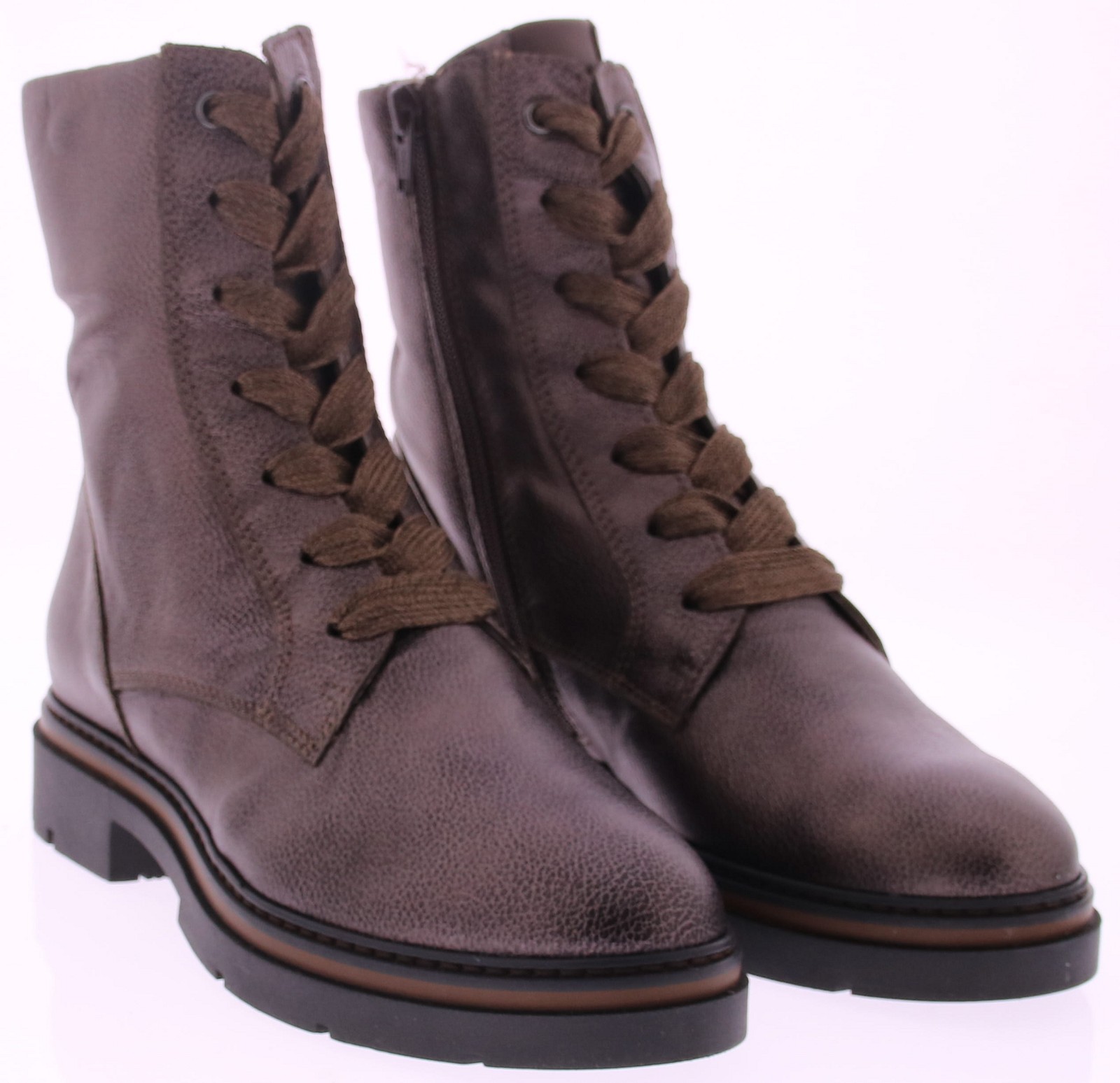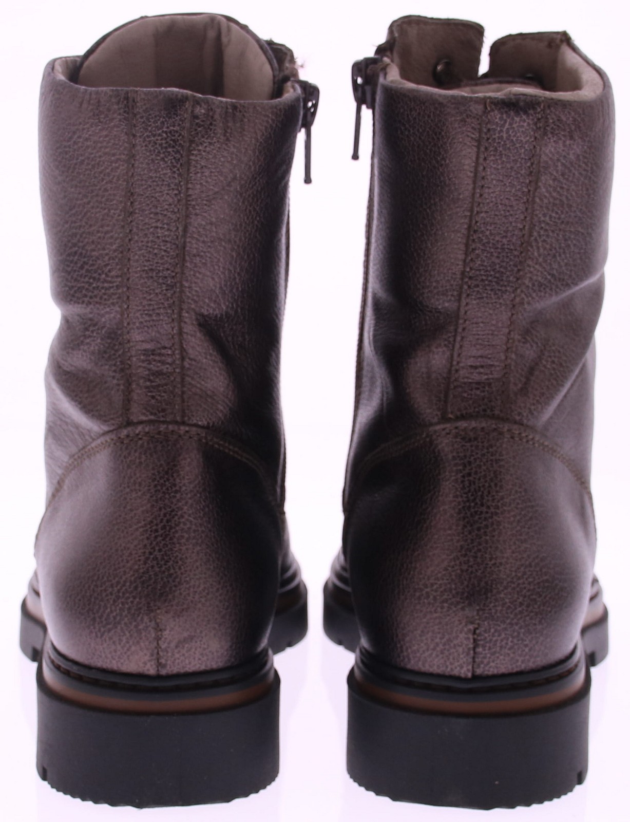 Bruin metallic leren dames veterlaars van DL Sport. Deze stoere maar vrouwelijke veterboot is uitgevoerd in metallic bruin grain leer, herkenbaar aan de subtiele structuur die het leer zijn sportieve uitstraling geeft. Het leer heeft een metallic effect voor een modische touch. Naast de vetersluiting is de boot voorzien van een ritssluiting aan de binnenzijde, wat zorgt voor extra gemak bij het aan-en uittrekken. Het uitneembare voetbed maakt deze schoen perfect voor eigen inlegzolen. De rubberen zool heeft een subtiel profiel waardoor hij wel sportief oogt, maar niet grof.