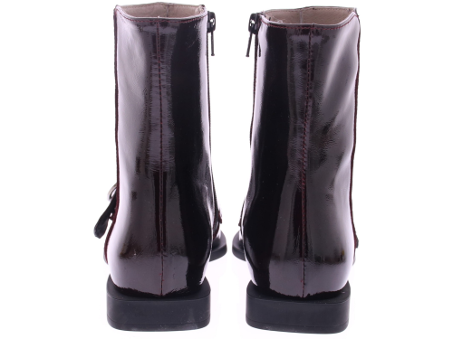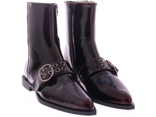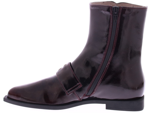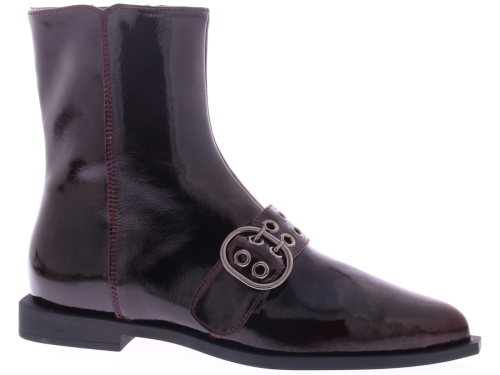 Bordeauxrode lak dames enkellaars van DL Sport. Maak een krachtige stijlstatement met deze gesplaars. De glanzende finish geeft een luxueuze en edgy uitstraling, terwijl het brede gespdetail met metalen oogjes op de wreef zorgt voor een modieus accent. Het laarsje heeft een ritssluiting aan de binnenzijde en is voorzien van een uitneembare binnenzool.
