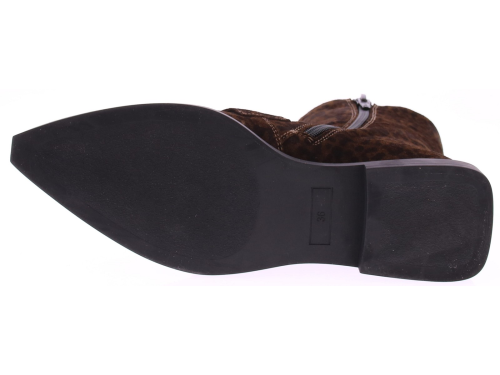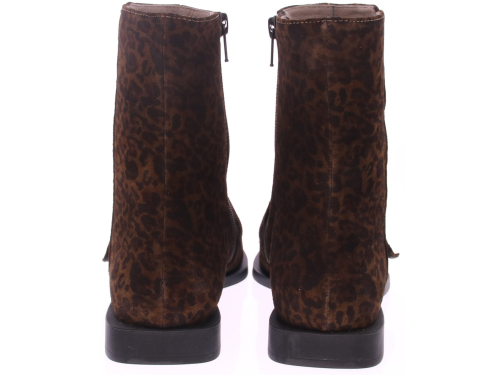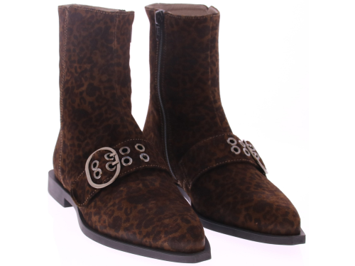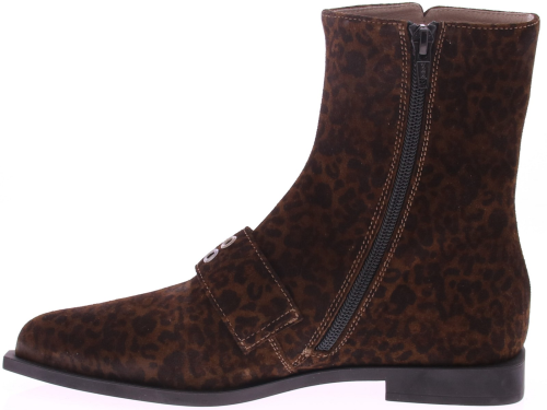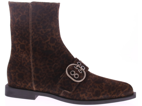 Bruin suede dames enkellaars met van DL Sport. Maak een krachtige stijlstatement met deze gesplaars. De panterprint in het suede geeft hem een modische uitstraling, terwijl het brede gespdetail met metalen oogjes op de wreef zorgt voor een stoer accent. Het laarsje heeft een ritssluiting aan de binnenzijde en is voorzien van een uitneembare binnenzool.
