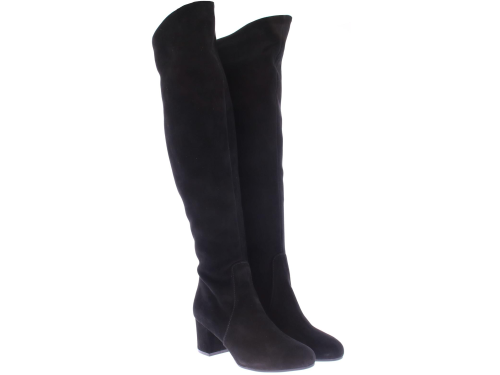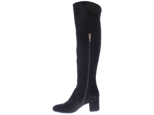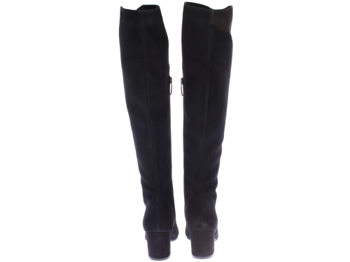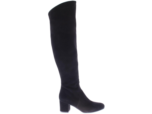 Zwart suede dames hoge laarzen van Donna Lei. Deze laars heeft een mooie afgeronde basic leest, komt net over de knie en heeft een blokhak van 5 cm hoog. Aan de binnenkant een driekwart rits om het aan en uit trekken te versoepelen. De zool is een combinatie van leer en rubber.