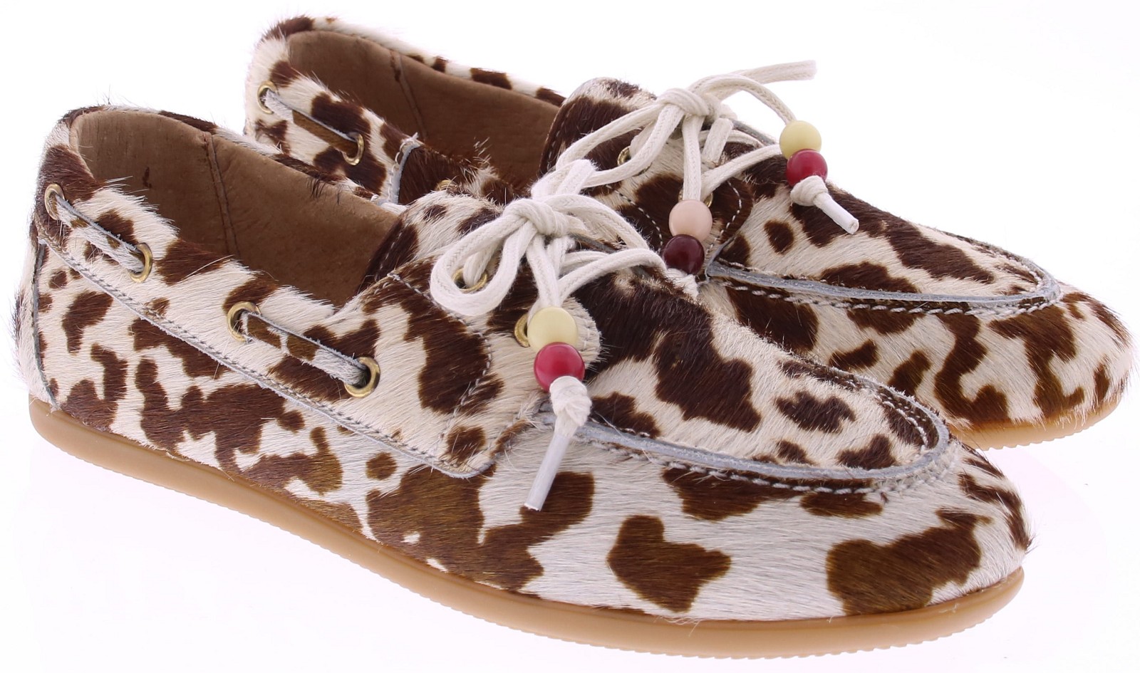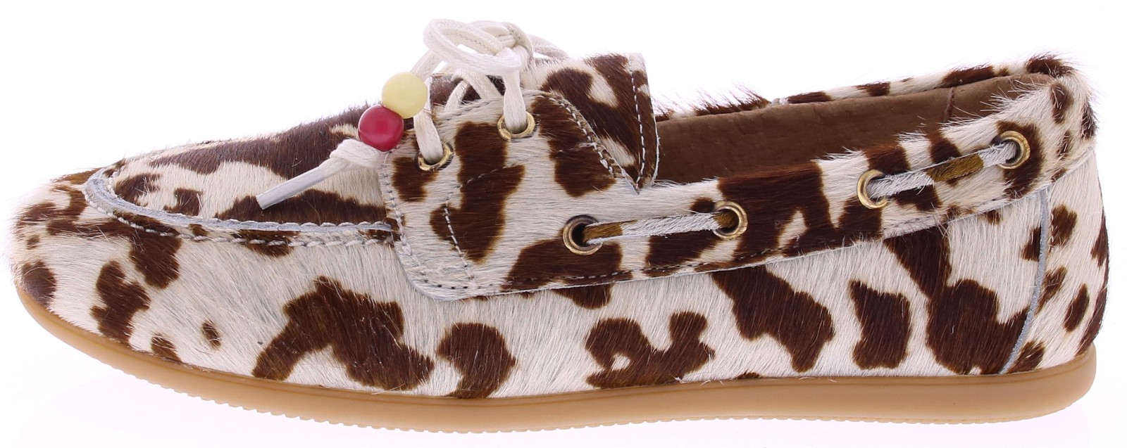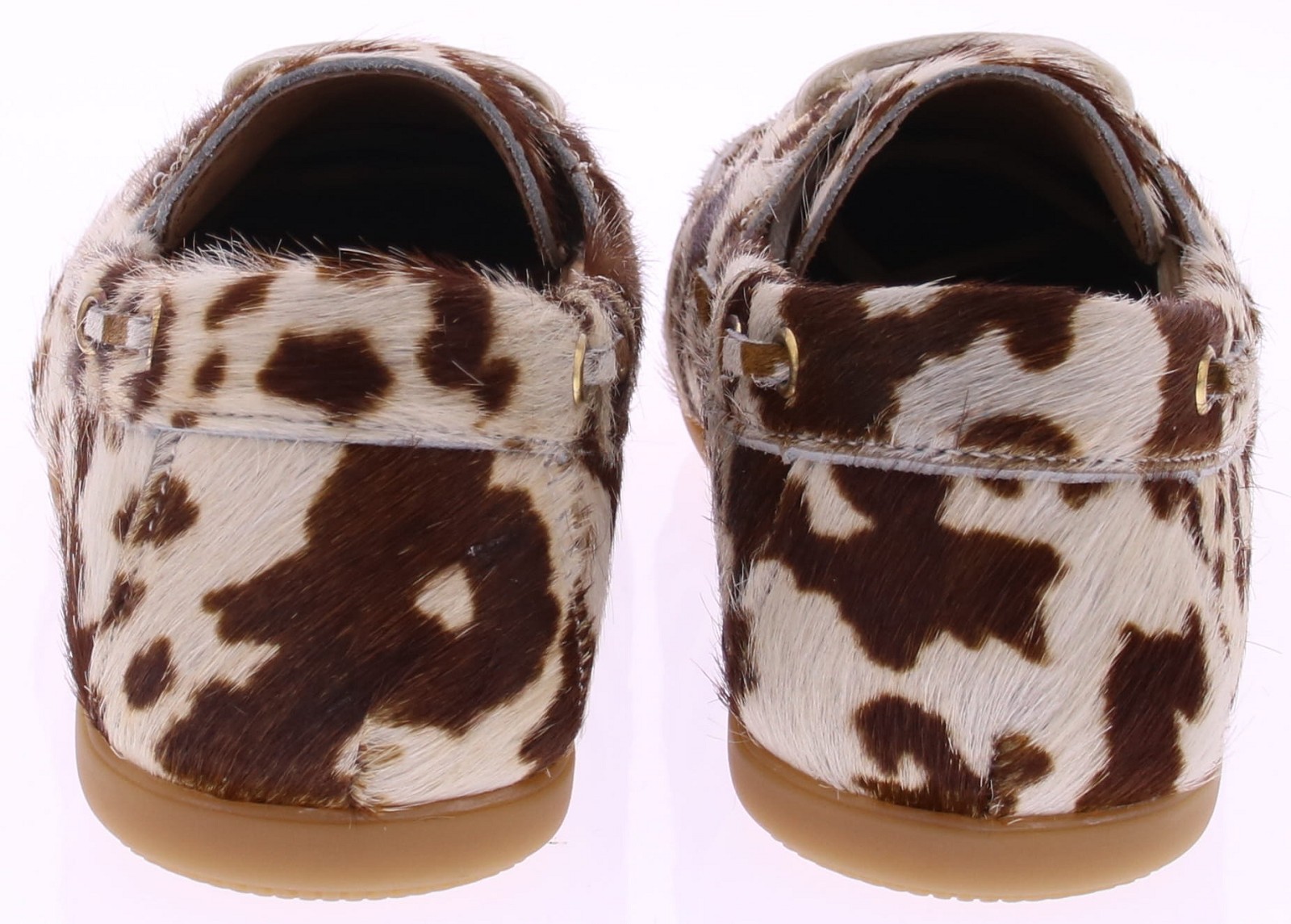 Koeienprint ponyhair dames bootschoen van DWRS. De Latty Mocassin in koeienprint is een echte musthave voor in je kast en kan het hele jaar door worden gedragen. De mocassin heeft een lichte (“latte”) zool en leren veters aan de voorzijde, waarmee je de schoen naar wens strakker kunt aantrekken. De buitenkant is gemaakt van ponyhair en de voering is van leer.