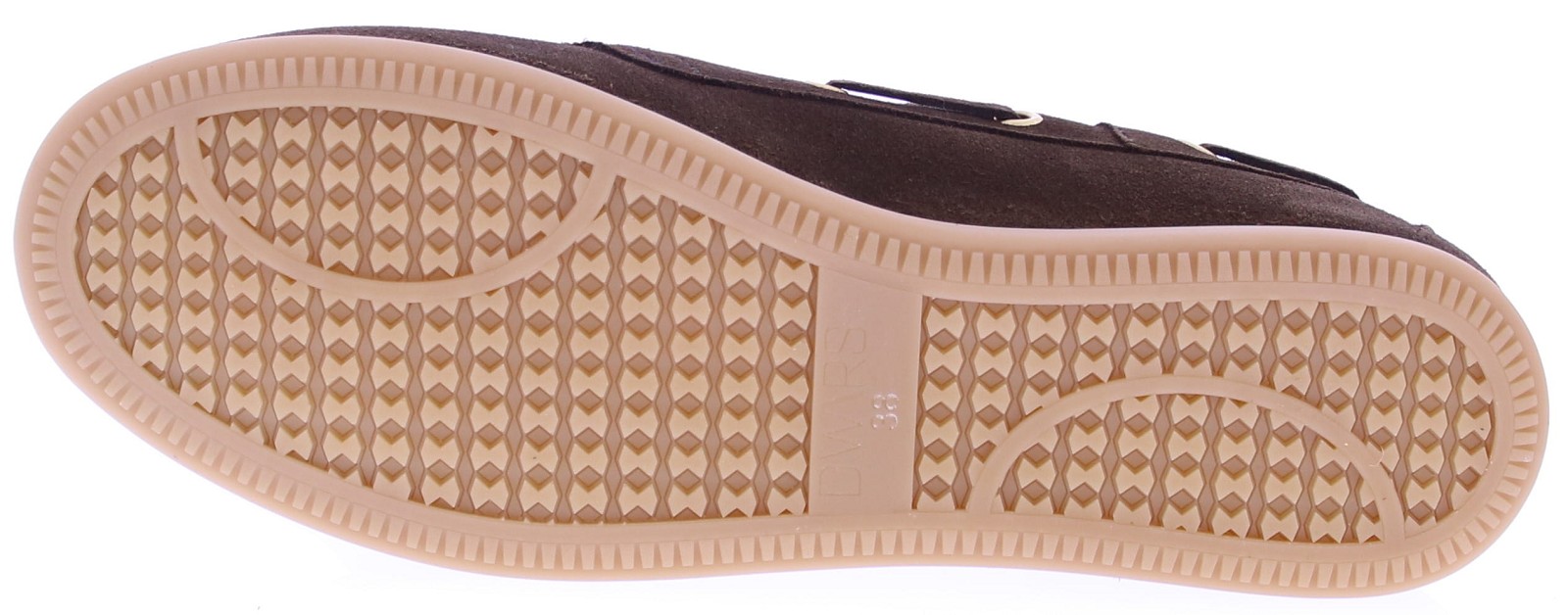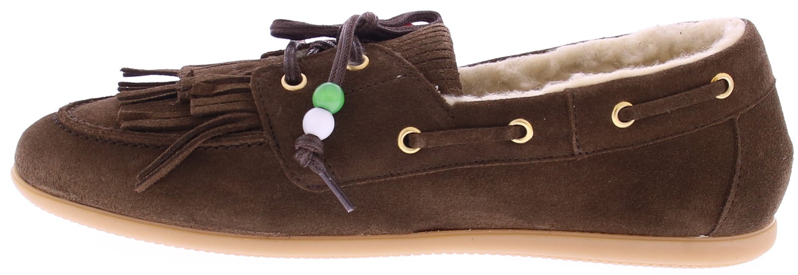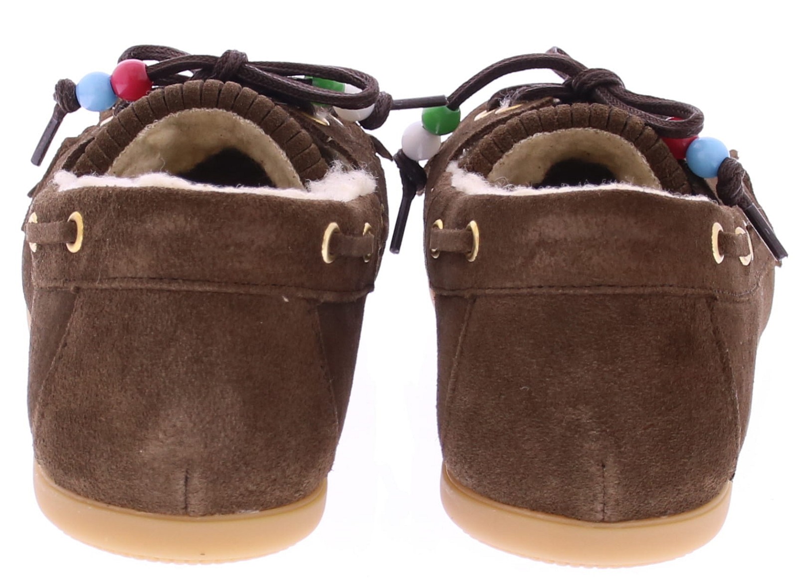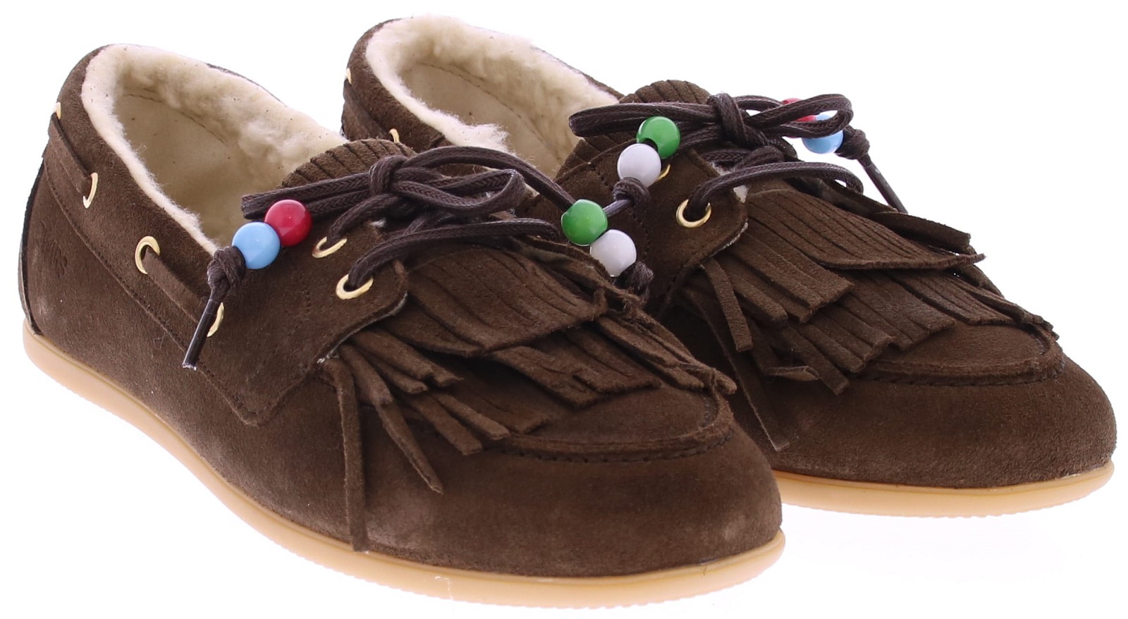 Donkerbruin suède dames bootschoen van DWRS. De Latty Fringes teddy is een absolute trend dit seizoen! De schoen heeft een platte zool en fringes en een vetersluiting op de voorkant waardoor je de schoen strakker kunt trekken. De Latty is aan de binnenkant gevoerd met teddy stof en aan de buitenkant gemaakt van suede. De kraaltjes aan de veters zitten er los bij en kunnen naar smaak worden aangepast.