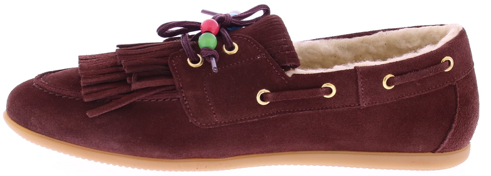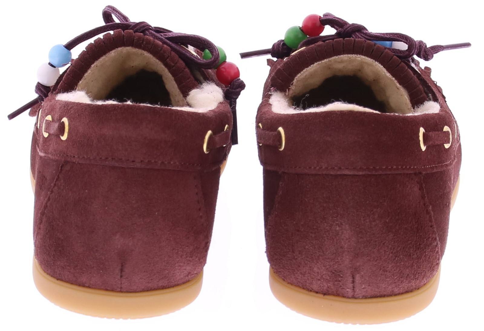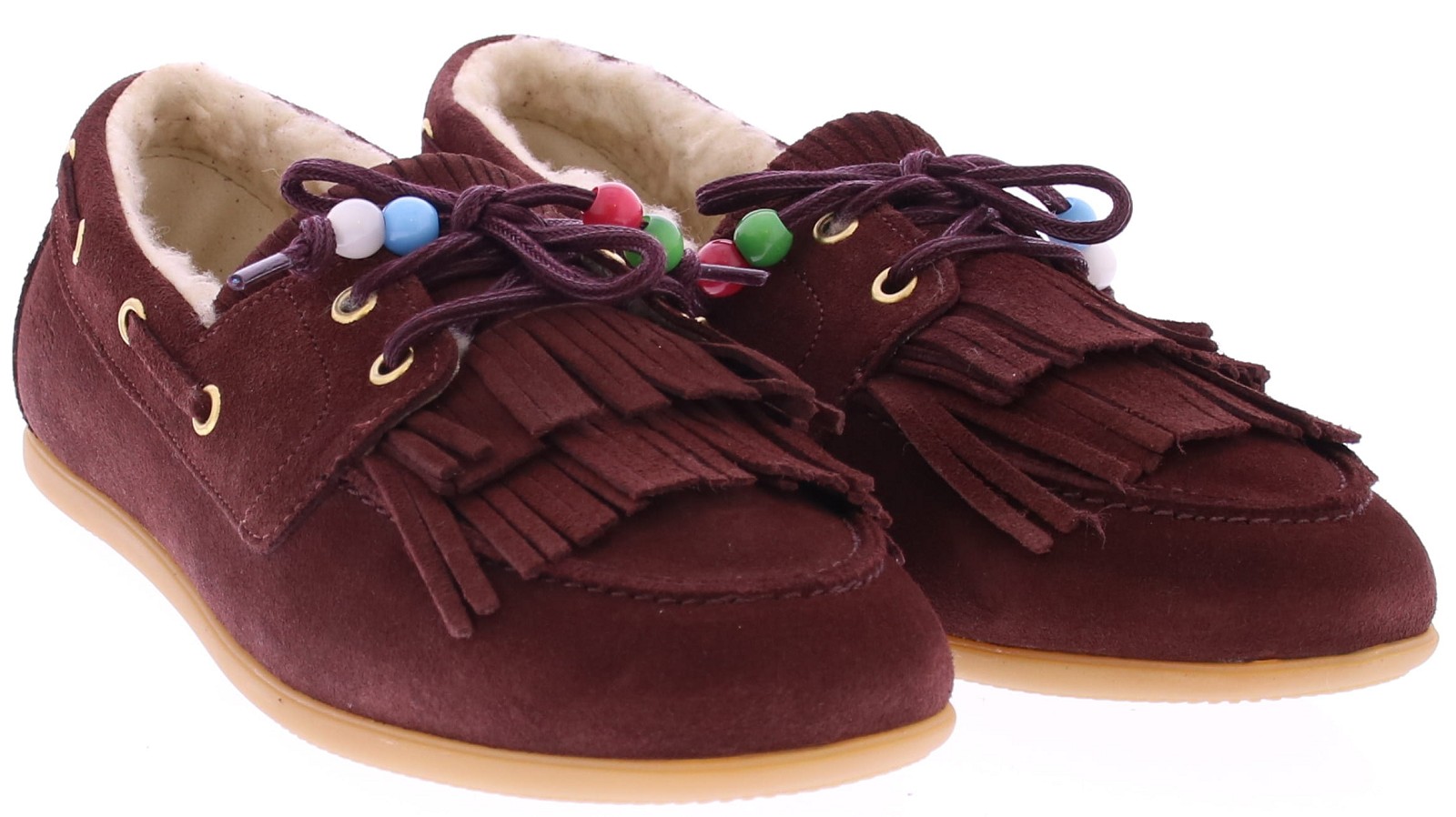 Bordeaux suède dames bootschoen van DWRS. De Latty Fringes teddy is een absolute trend dit seizoen! De schoen heeft een platte zool en fringes en een vetersluiting op de voorkant. De Latty is aan de binnenkant gevoerd met teddy stof en aan de buitenkant gemaakt van suede. De kraaltjes aan de veters zitten er los bij en kunnen naar smaak worden aangepast.