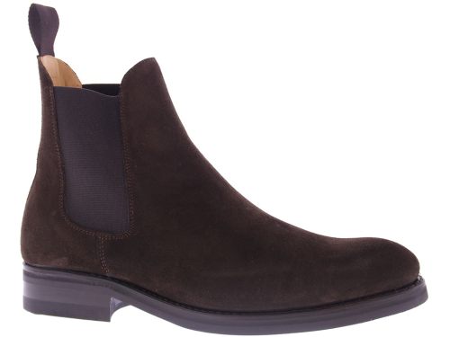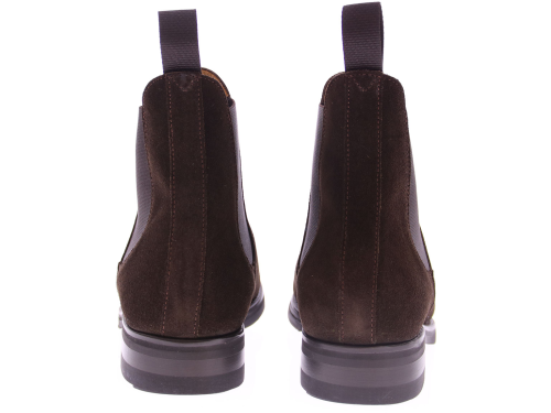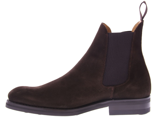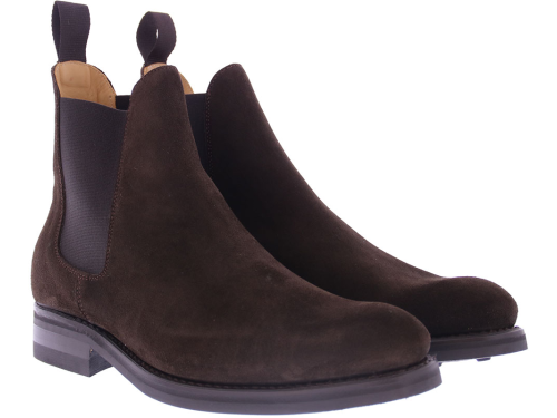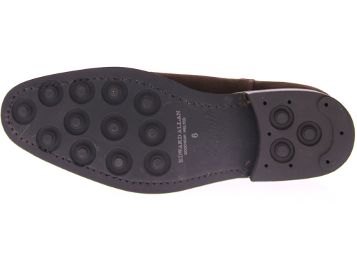 Heren Chelseaboot van Edward Allan in donkerbruin suede op een danaite rubber zool. De schoen is goodyear gemaakt en heeft een leren voering.
