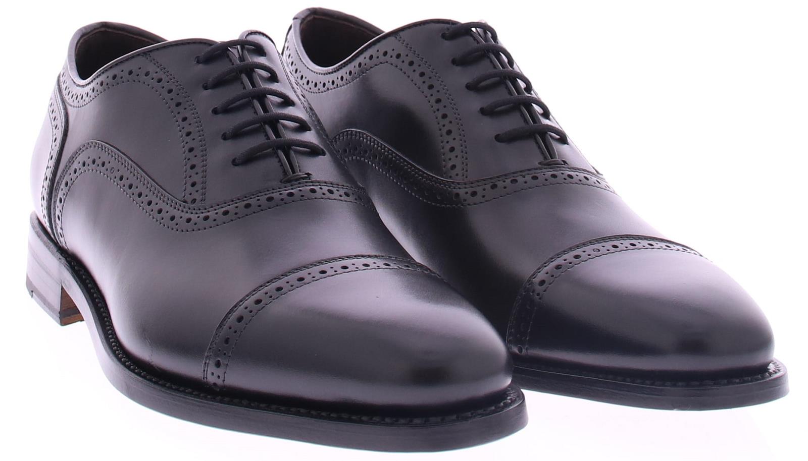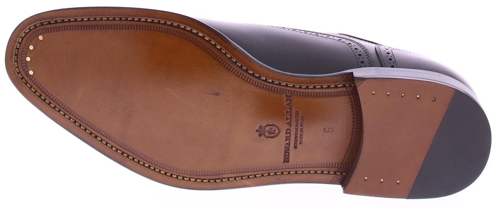 Heren veterschoen van Edward Allan met neusnaad en perforatie lijnen. Deze schoen is een semi brogue model. De schoen heeft een zwart kalfsleren bovenwerk en is gemaakt op een leren zool. De voering is van kalfsleer en de constructie is goodyear.