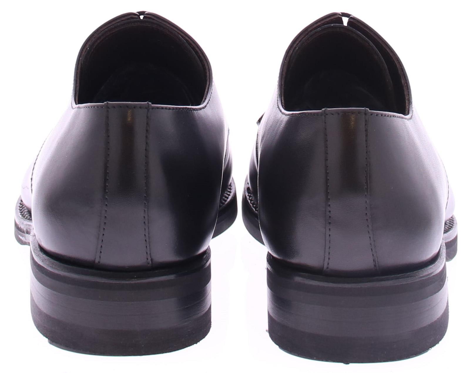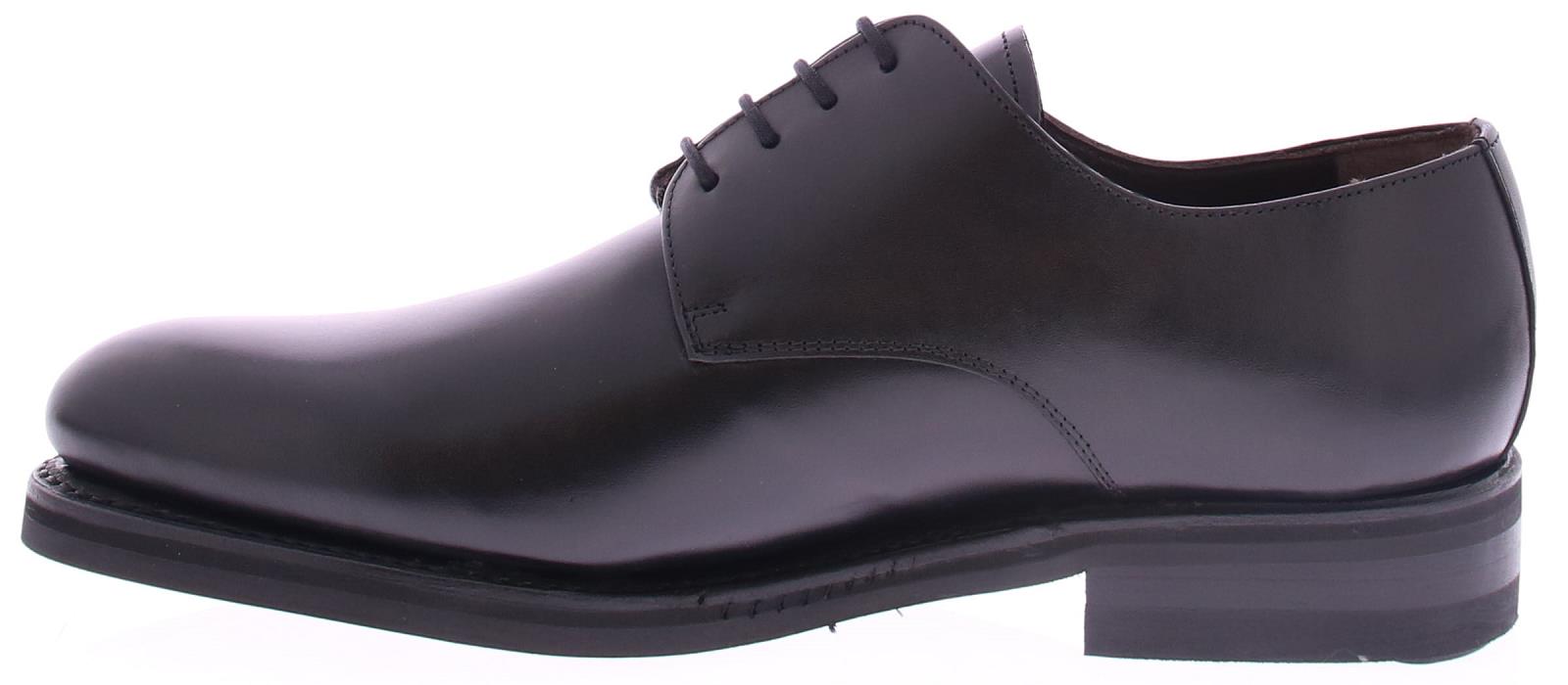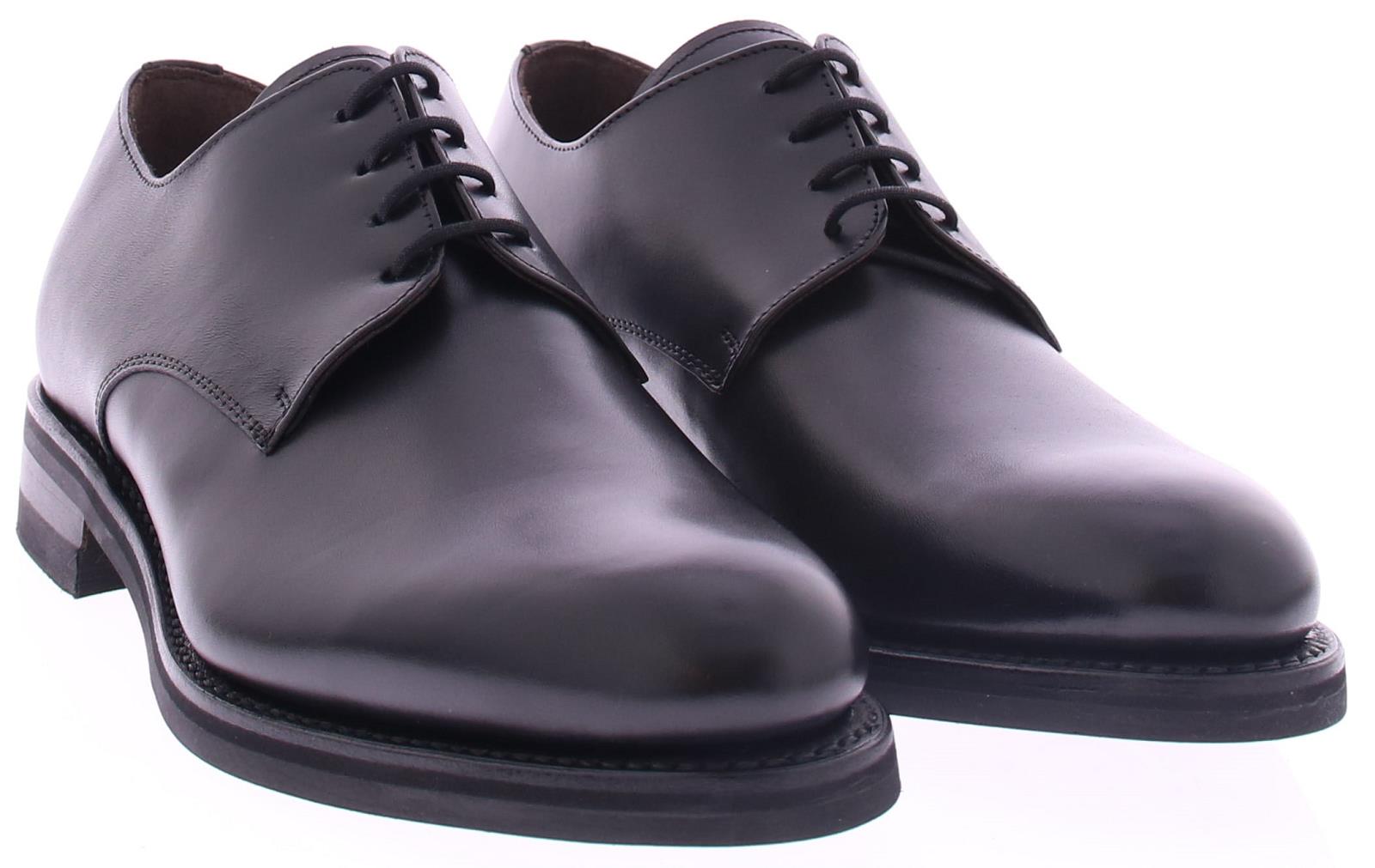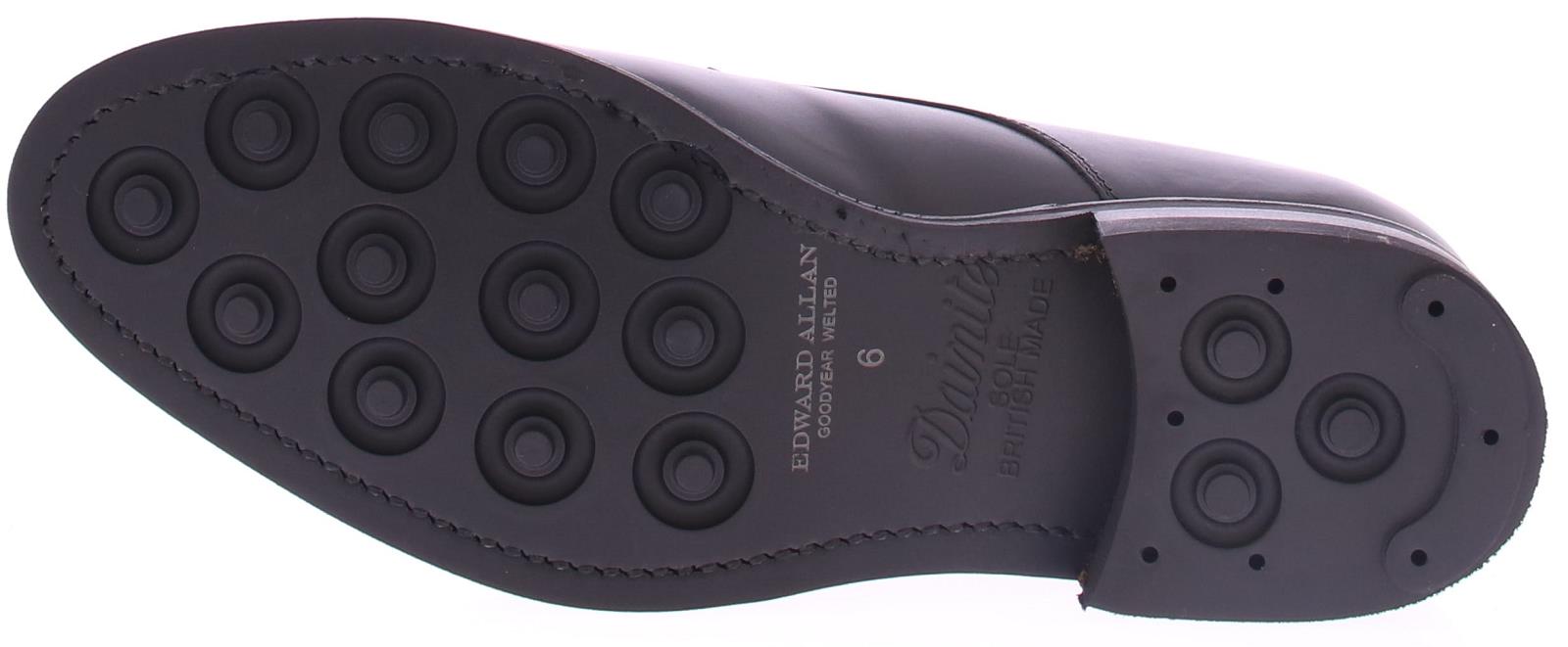 Heren veterschoen van Edward Allan. De schoen heeft een glad voorblad met een derby sluiting. Het bovenwerk is van glad zwart kalfsleer. De zool is van rubber en de maakwijze is goodyear.