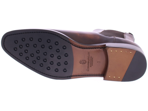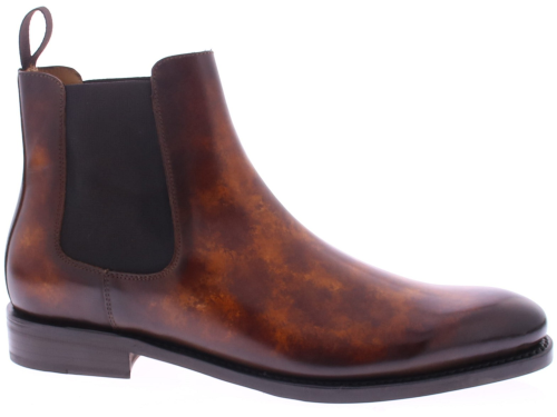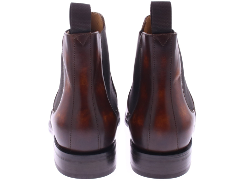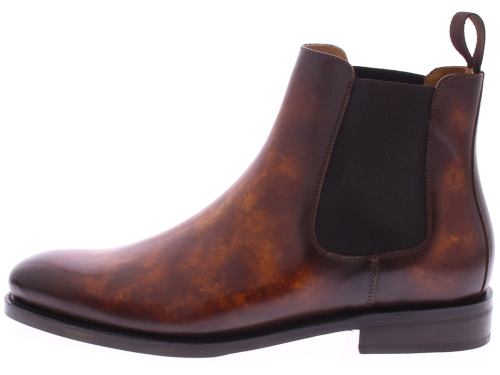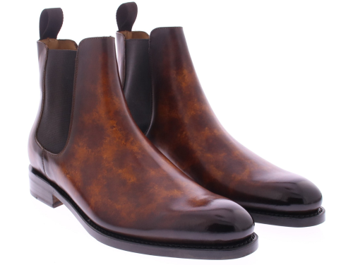 Heren chelseaboot van Edward Allan uitgevoerd in kalfsleer met een schilpadachtige hand finish van verschillende bruin tinten. De schoen heeft een leren zool met rubber inzet en is geheel goodyear gemaakt. De voering is van leer.