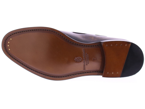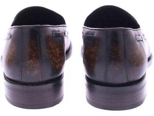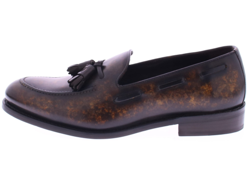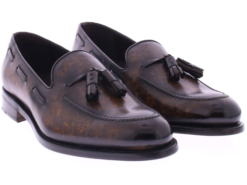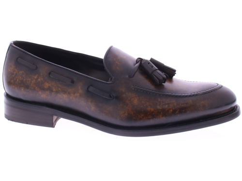 Heren instapper met kwastjes van Edward Allan uitgevoerd in een schildpadprint hand finish op kalfsleer. De schoen heeft een bruin leren voering en een zool van leer. Door de manier van kleuren heeft deze schoen een uitgesproken karakter en kan men het vakmanschap van de maker zien.