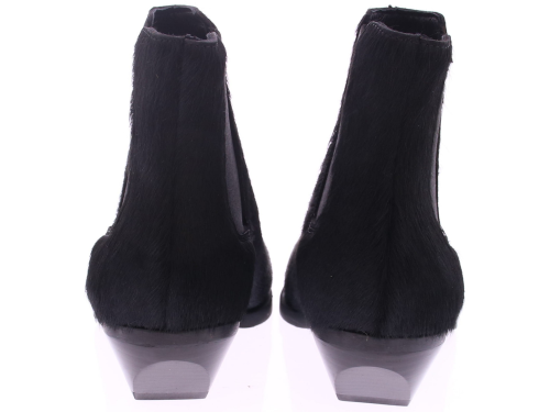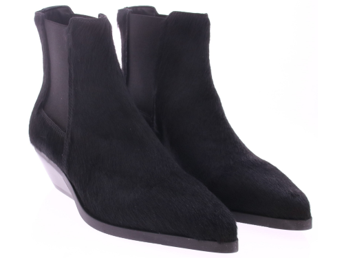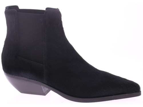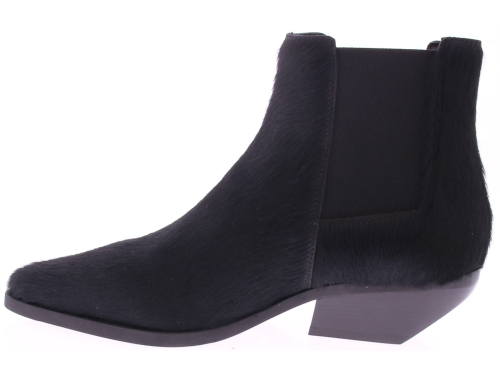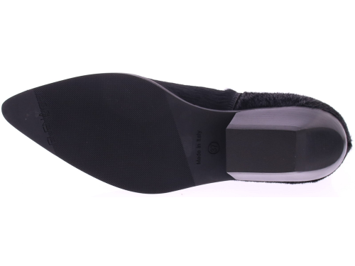Zwart pony hair dames enkelboot van Elena Iachi. Het laarsje is uitgevoerd in zwart ponyhair, wat zorgt voor een, levendige textuur en een unieke uitstraling. De licht carré neus geeft de schoen een moderne en verfijnde vorm, terwijl de schuin geplaatste hak van 5 cm niet alleen voor een vrouwelijke touch zorgt, maar ook comfortabel loopt. Aan de zijkant is een elastisch inzetstuk verwerkt, wat samen met het ritsje aan de binnenkant zorgt voor een makkelijke instap en een fijne pasvorm. Dit laarsje combineert moeiteloos stoer en elegant en laat zich perfect dragen onder een jeans, rok of jurk.